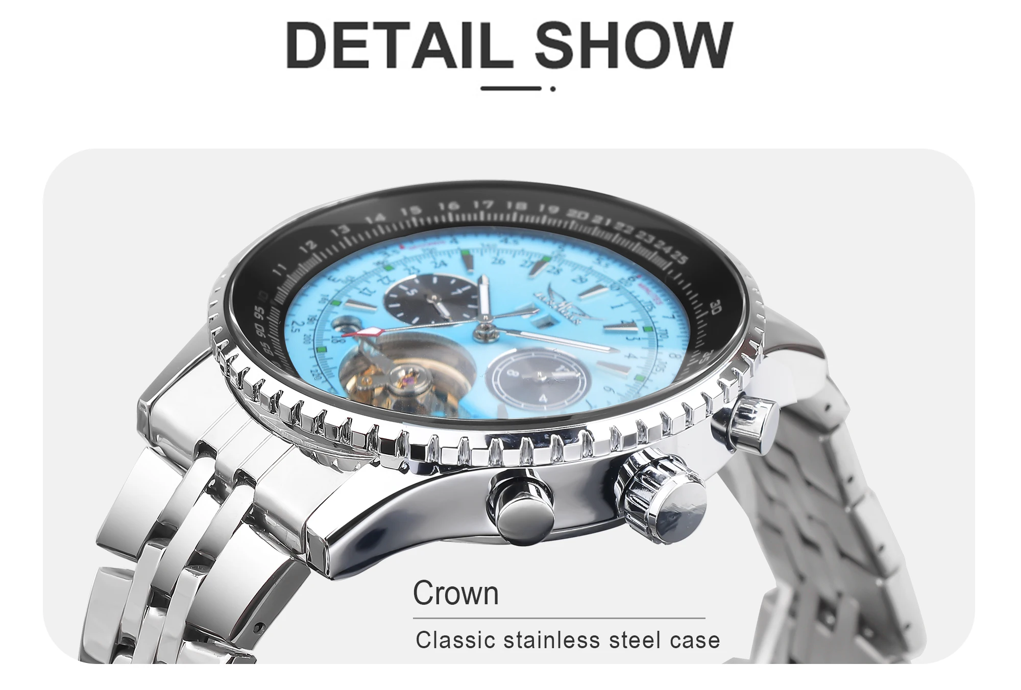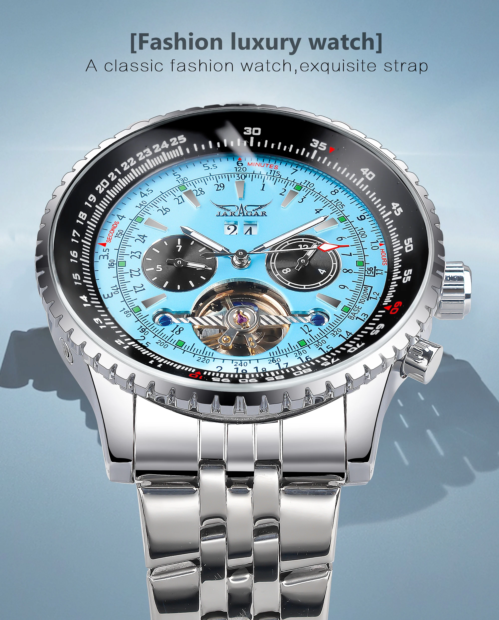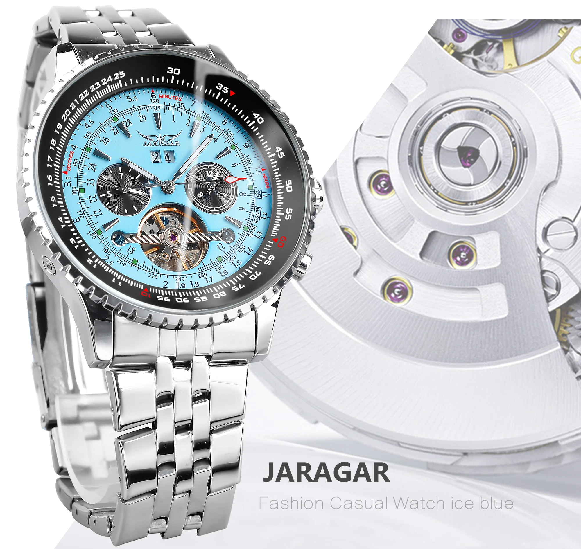 Jaragar Mens Automatic Mechanical Watch Fashion Tourbillon Blue Dial Date Display Stainless Steel Strap Military Sport Watches