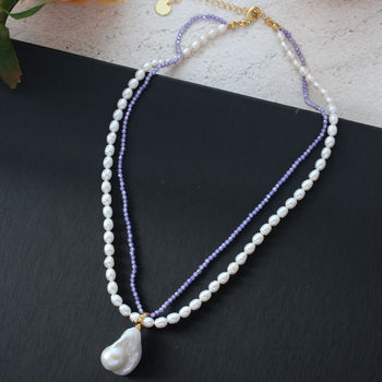 Natural Amethyst & Freshwater Pearls Layered Necklace with Baroque Pearl Pendant 24K Gold Plated Chain Gift for Women