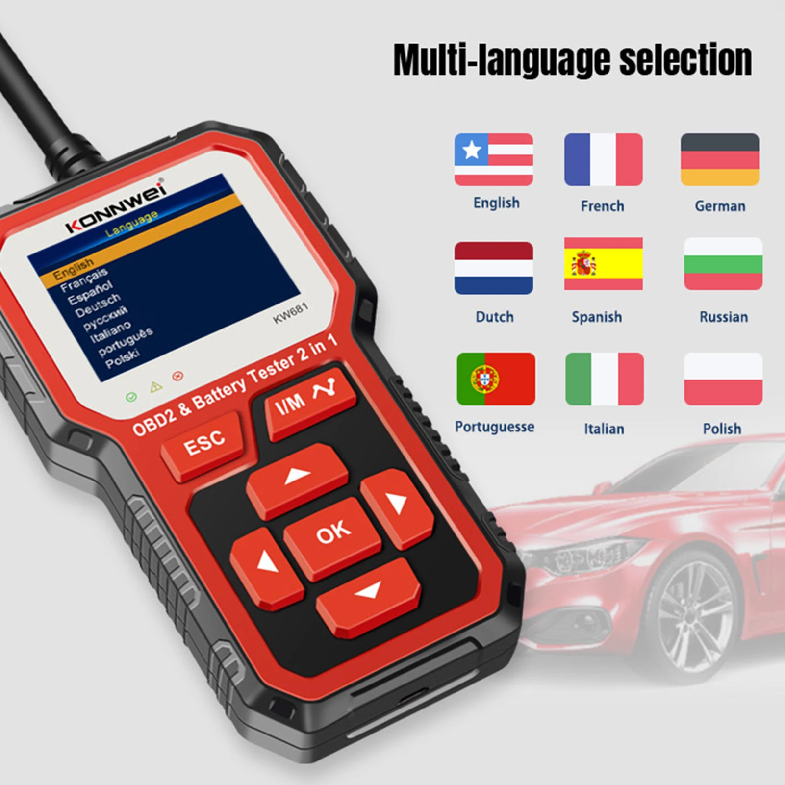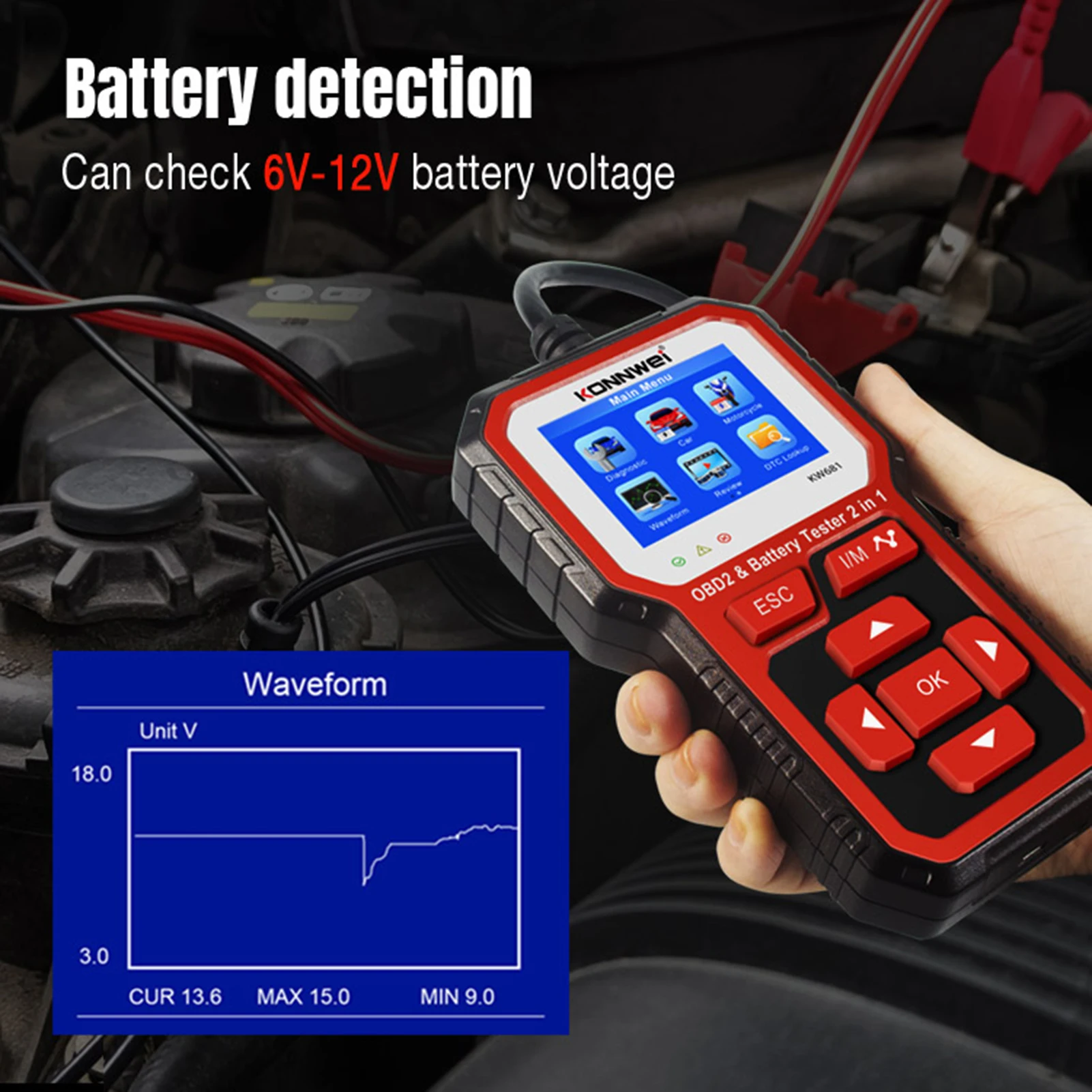 KONNWEI KW681 Car&Motrocycle Battery Tester & OBDII Diagnostic Scanner Tool 2 in 1