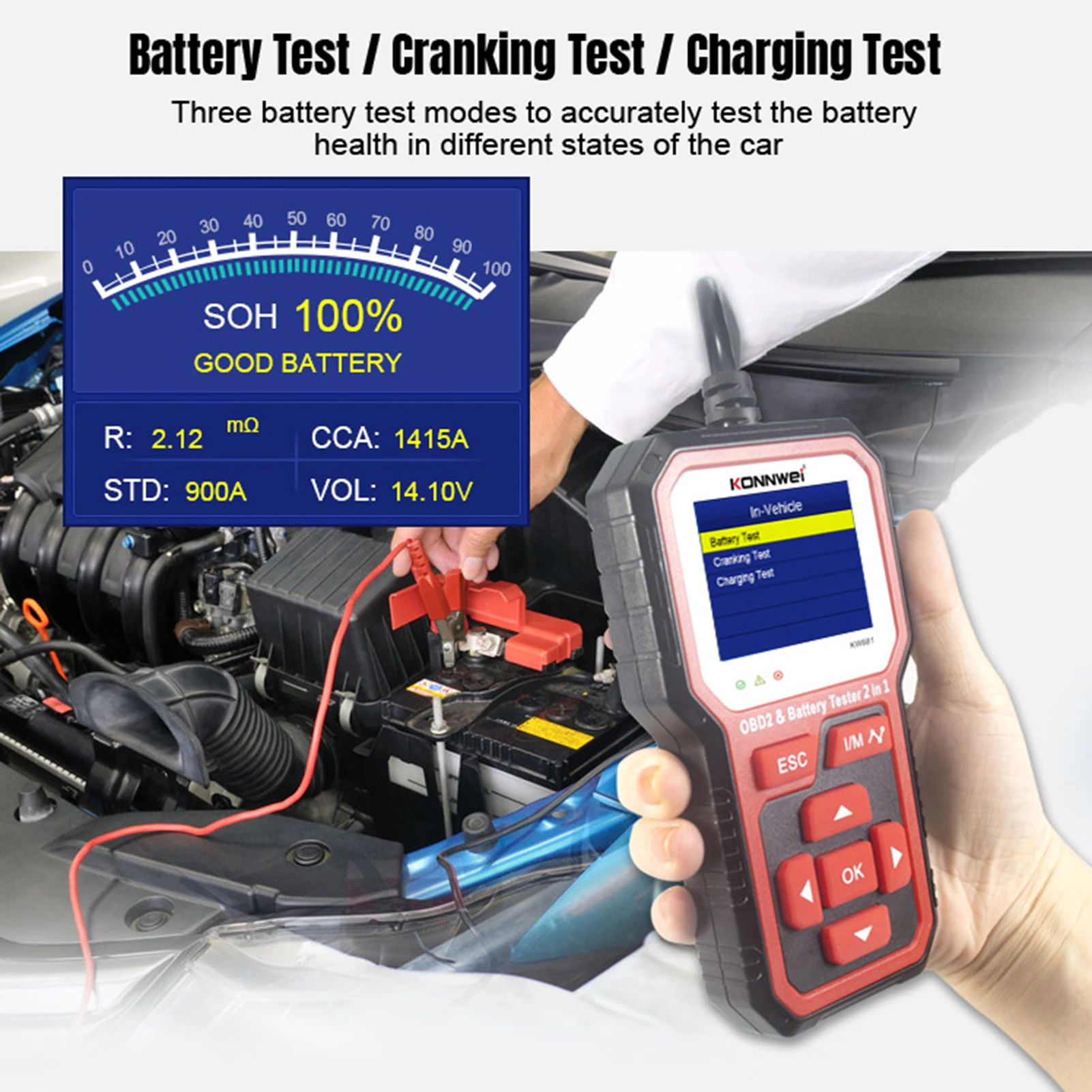 KW681  Battery Tester can Test all automotive cranking lead acid battery, including ordinary lead acid battery, AGM flat plate battery, AGM spiral battery, and Gel battery, etc. it adopts the state-of-the -art conductance testing technology in the word to easily, quickly and accurately measure the actual cold cranking amps capability of the vehicle starting battery, healthy state of the battery itself, and common fault of the vehicle starting system and charging system, which can help maintenance personnel to find the find the problem quickly and accurately, thus to achieve quick vehicle repair.