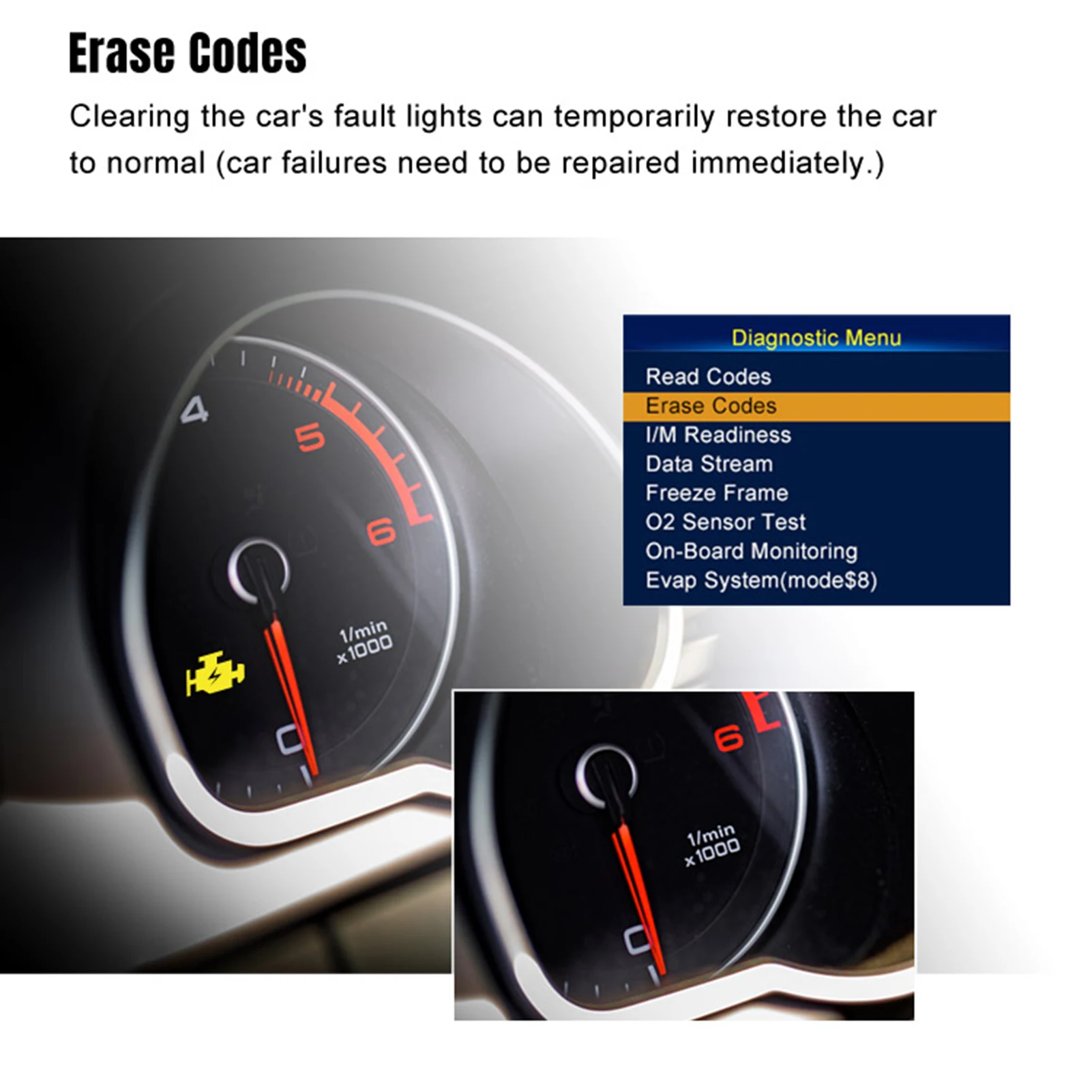 Read codes,erase codes,I/M readiness,data stream,freeeze frame,o2 sensor test,onboard monitoring,evap system(mode$B),vehicle information,DTC lookup.