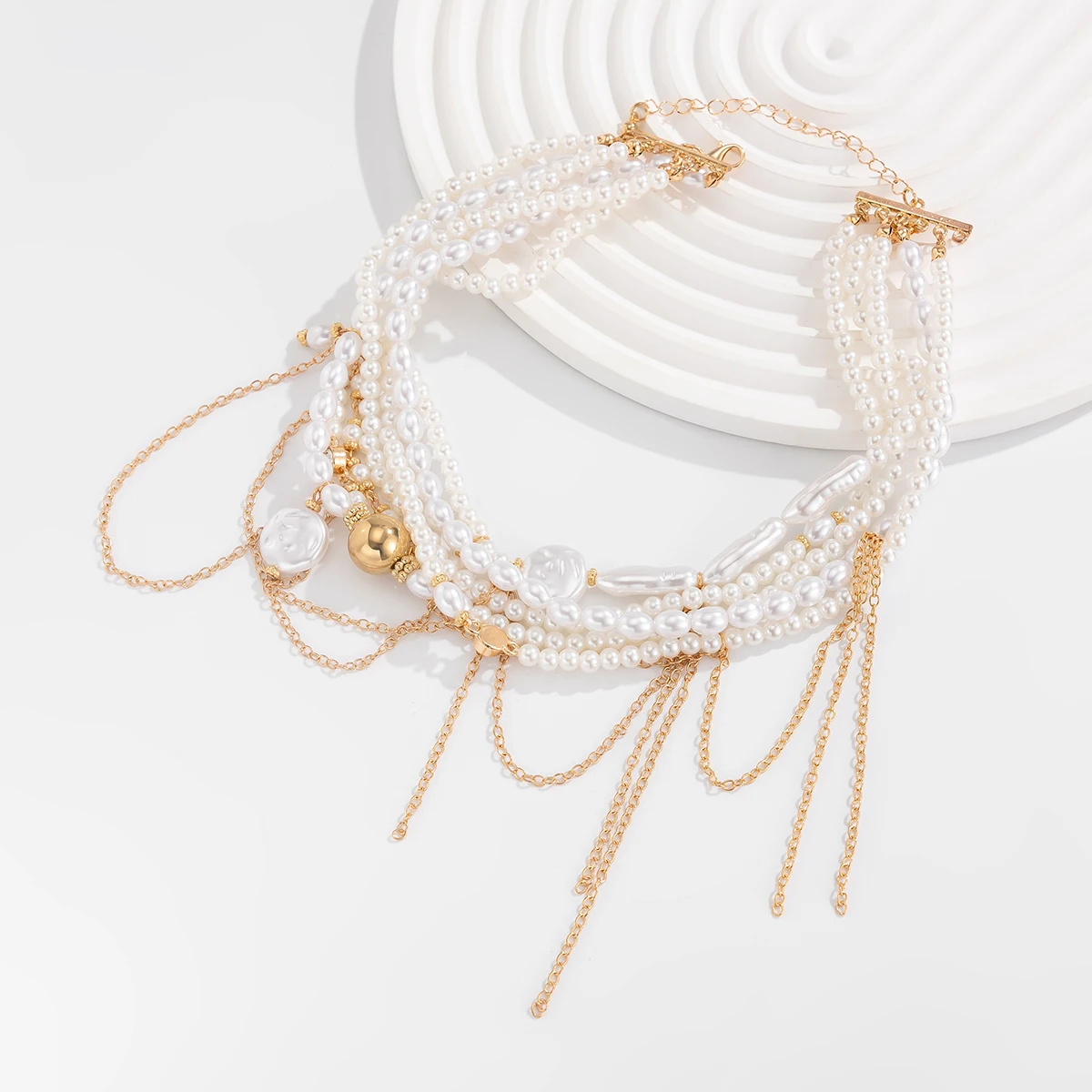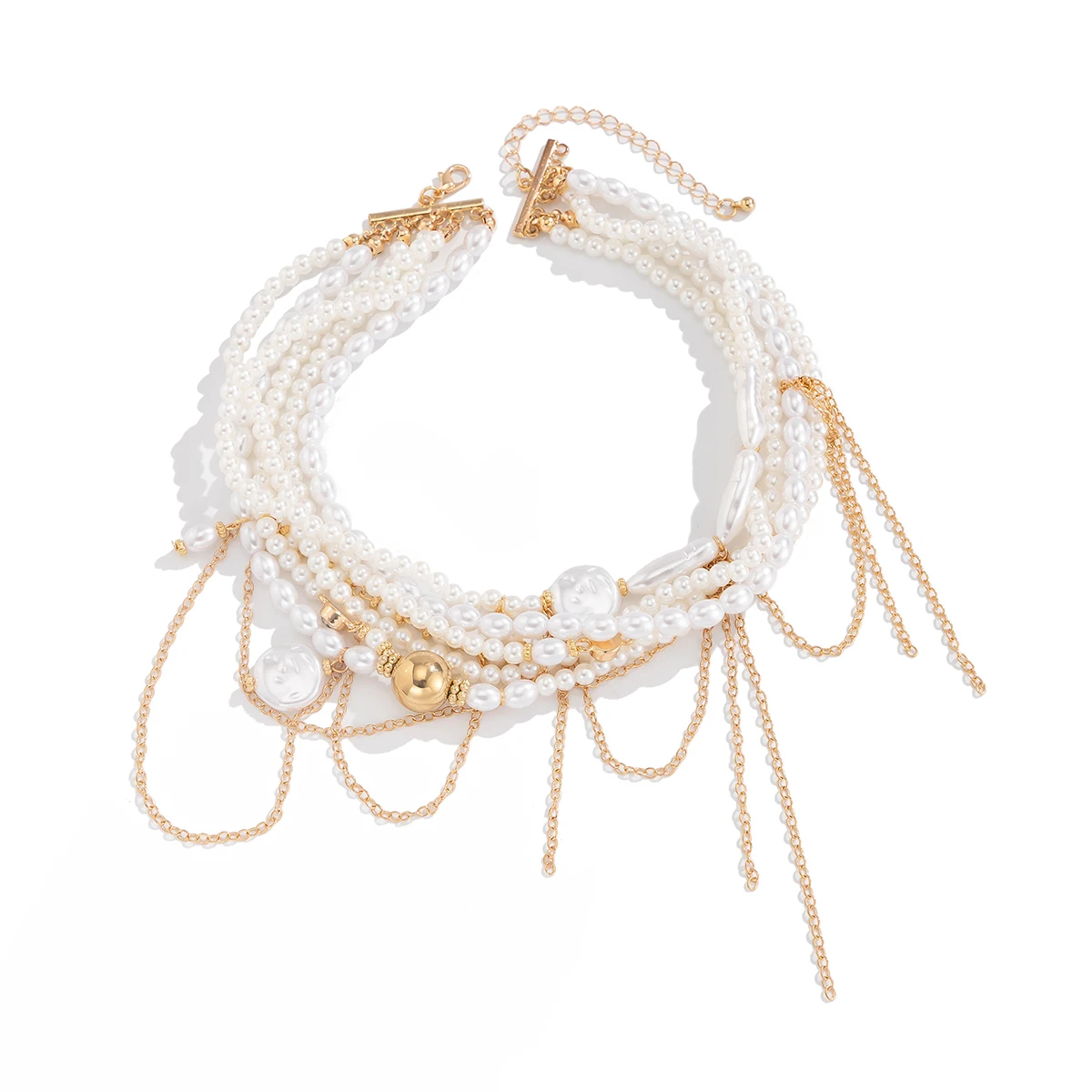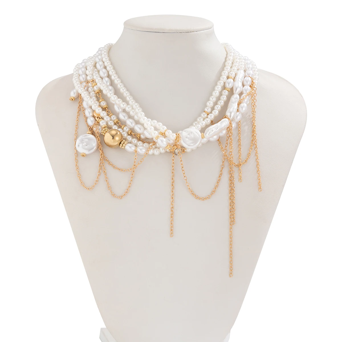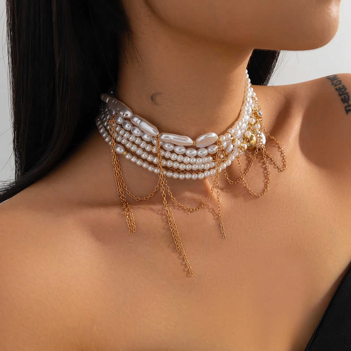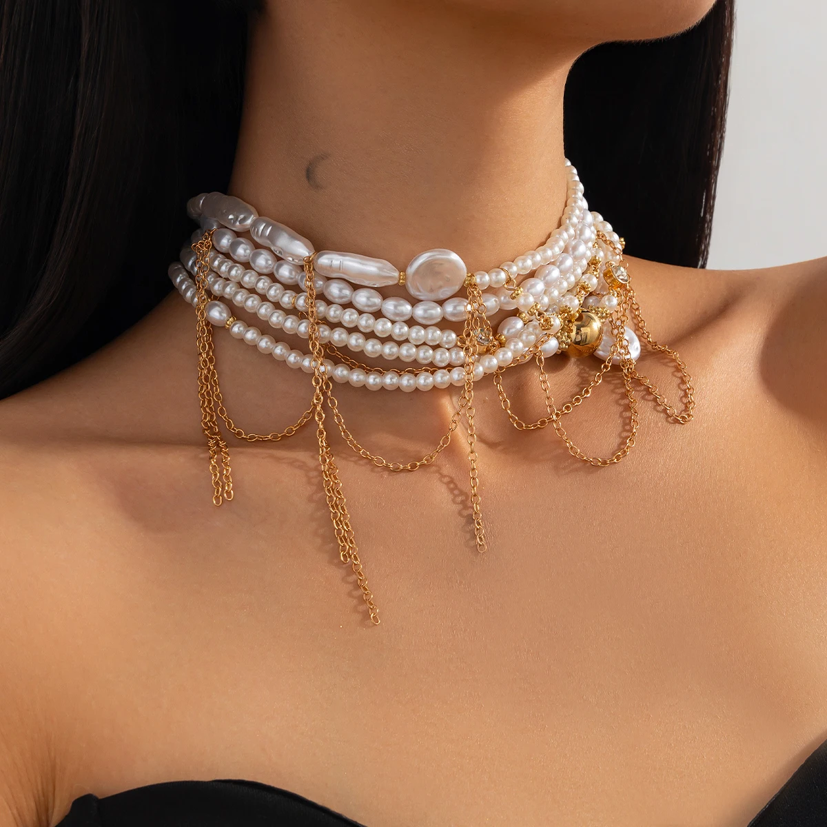 KunJoe New Gothic Multi Layer Imitation Pearl Choker Necklace for Women Vintage Gold Color Tassel Chain Necklace Party Jewelry