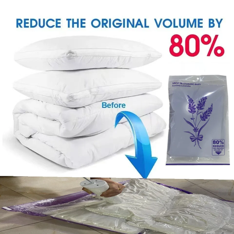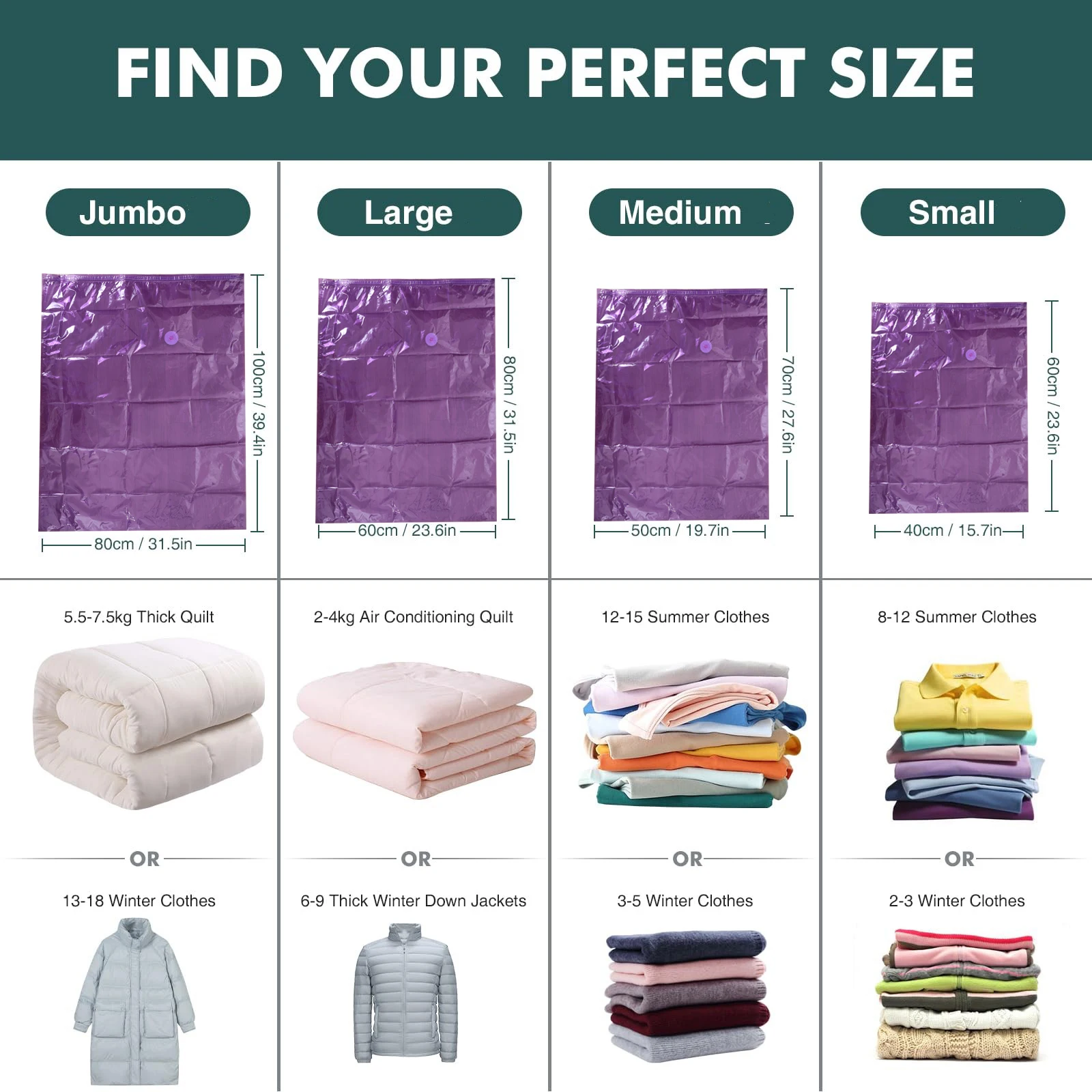 ⭐【Increase 80% Storage Space】 Our vacuum seal bags for clothing add more room to your clothes storage & wardrobe, lofts & suitcase by 4 times. The vacuum storage bags can be used for a variety of items including clothes, comforters, pillows, duvets, beddings, etc.