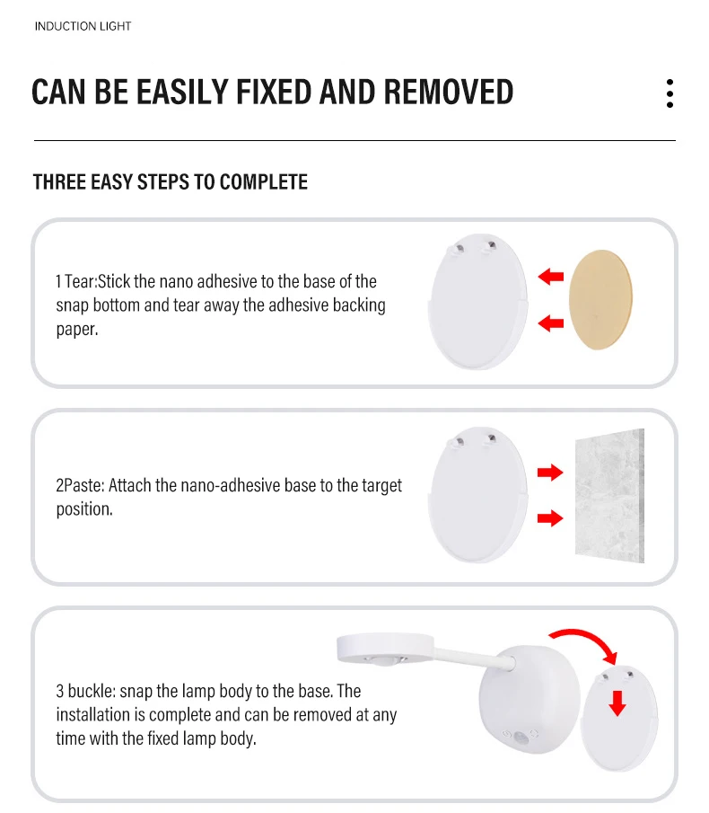 3 buckle: snap the lamp body to the base.Theinstallation is complete and can be removed at anytime with the fixed lamp body.