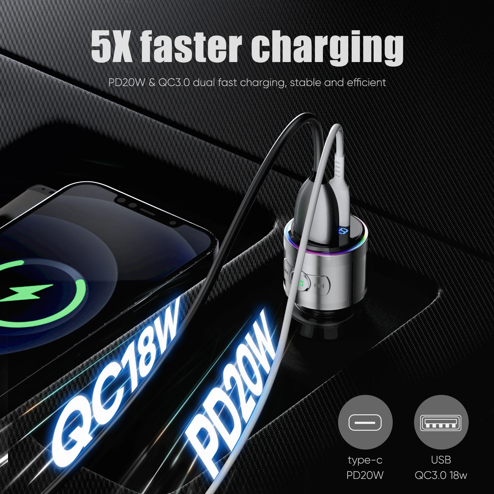 This wireless bluetooth car adapters are equipped with PD 20W & QC3.0 Fast Charger, which can provide up to 5X charging speed for 2 devices at the same time. You can use this FM transmitter to charge your phone, pad, switch, etc. It comes with smart charge monitoring to prevent overload, overcharge, short circuit and other accidental situations