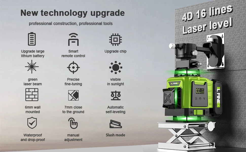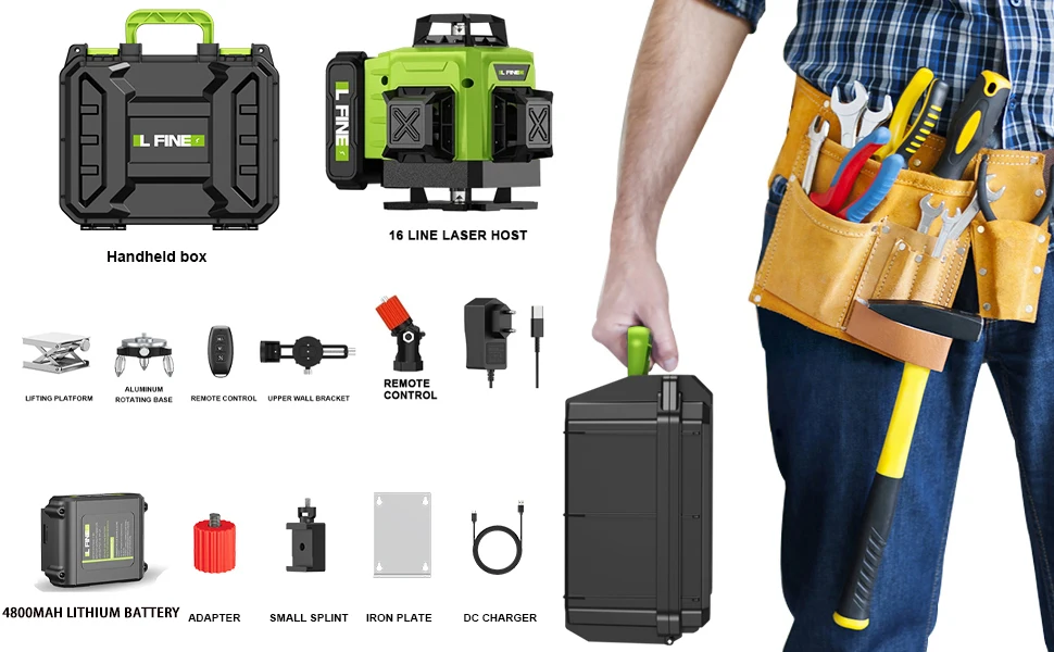 LFINE self leveling laser level equipped with 1packs 4800mAh Li-ion battery,support you working up to 6 hours with 16 lines all tun on.And with the charger included,you can take the laser level out with one battery installed,and left one charging at home,make sure always have one full-charged for use.