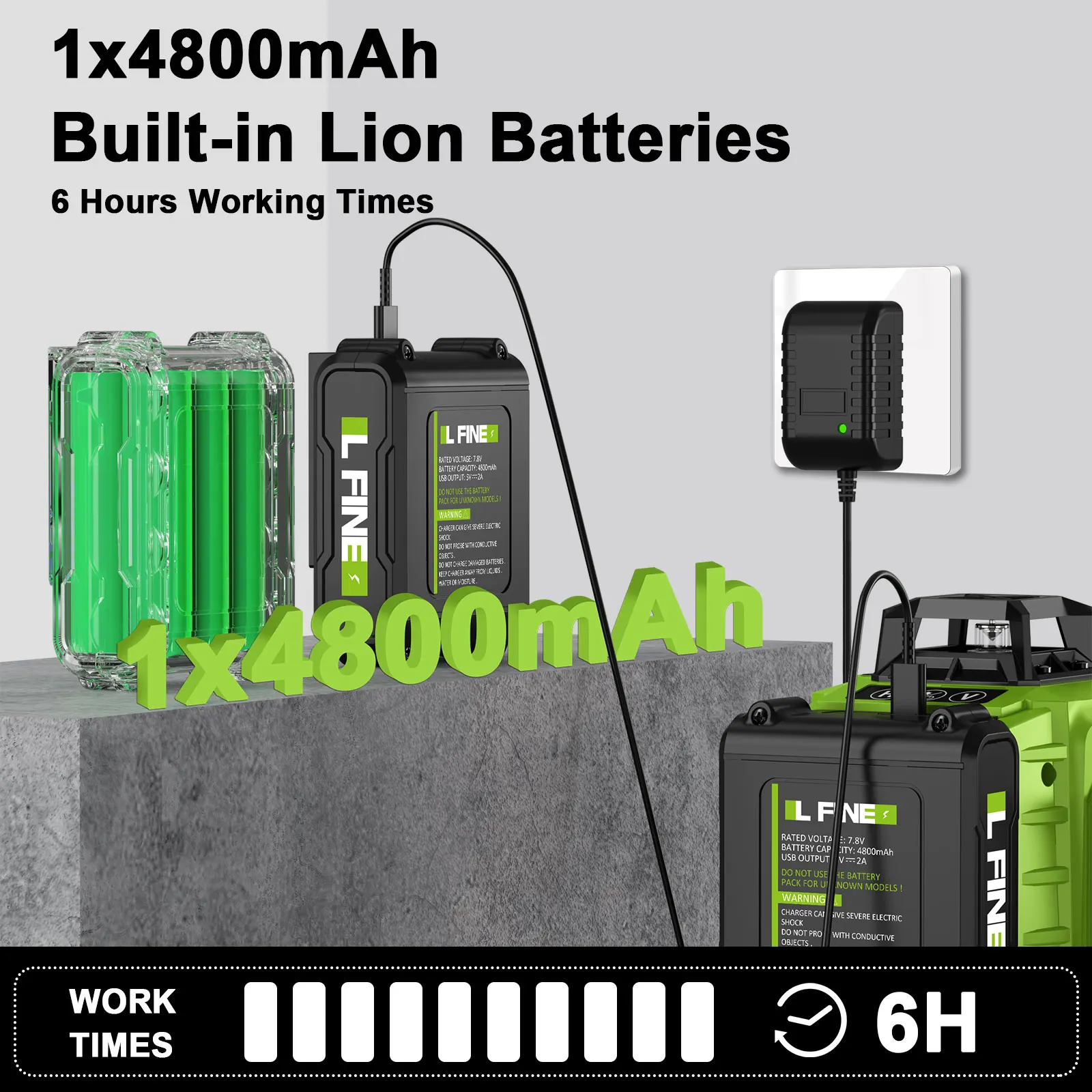 lfine self leveling laser level equipped with 1 packs 4800mAh Li-ion battery,support you working up to 6 hours with 16 lines all tun on.And with the charger included,you can take the laser level out with one battery installed,and left one charging at home,make sure always have one full-charged for use.