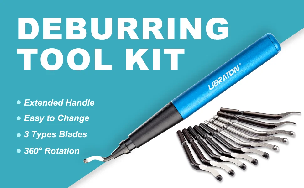Libraton deburring tool kit includes a 6-inch aluminum handle and 11 HSS blades (6 PCs BS1010, 3 PCs BS1018, and 2 PCs BK3010).