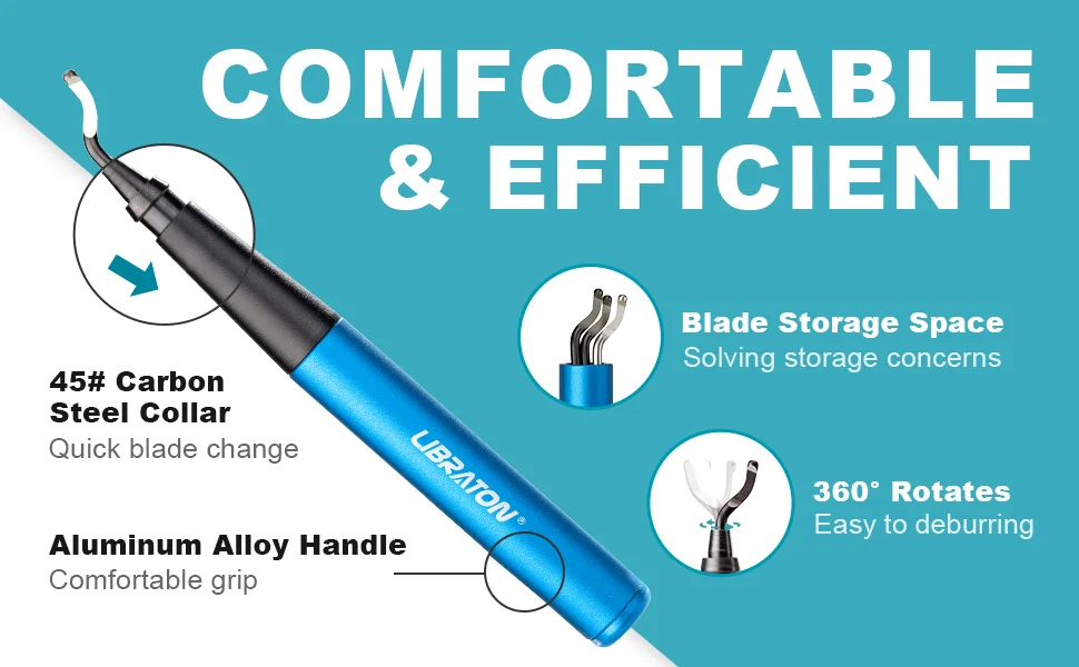 【Superior Quality】The ergonomic handle of the deburring tool kit is made of sturdy aluminum alloy, which is comfortable to hold, and equipped with a 45# carbon steel blade bayonet for longevity.