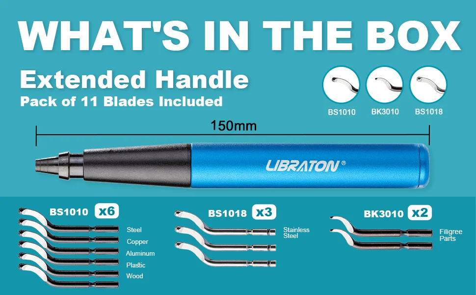 【12-in-1 Kit】Libraton deburring tool kit includes a 6-inch aluminum alloy handle and 11 HSS blades (6pcs BS1010, 3pcs BS1018, and 2pcs BK3010).