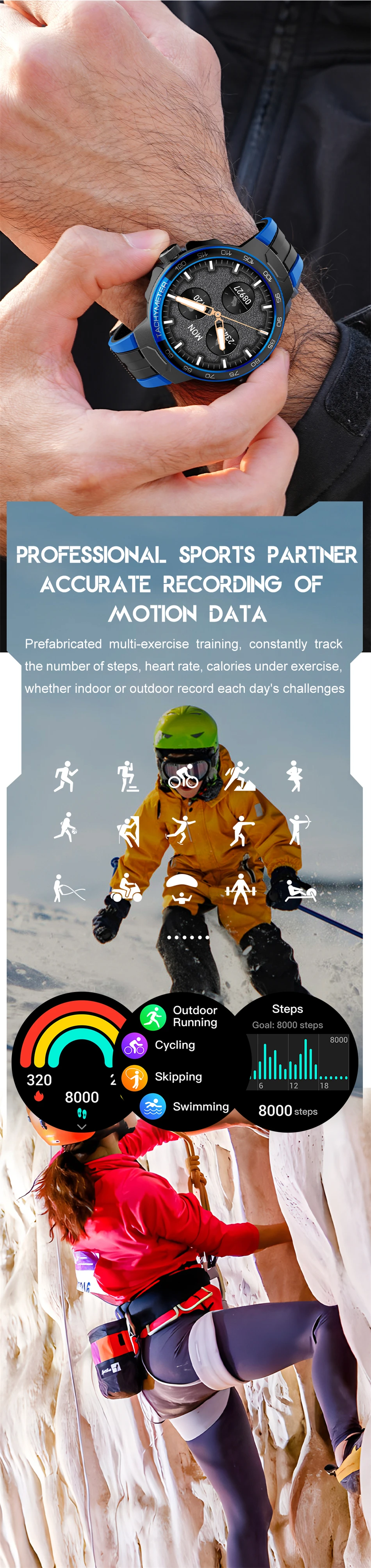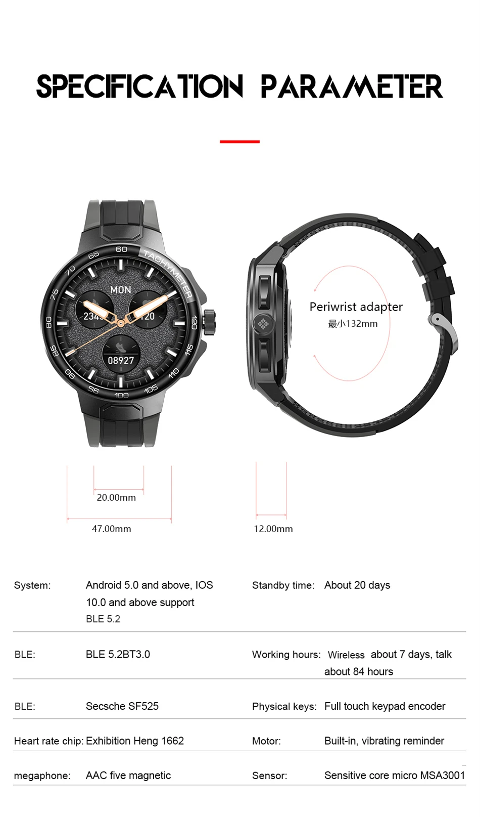 Standard motion functions (step counting, distance, calories), GPS track motion , There are three menu effects, cellular and rotary, array, five mechanical digital dial, with mass dial and custom dial, 20 message storage reminder view, sliding adjustment to increase or decrease, volume and brightness.