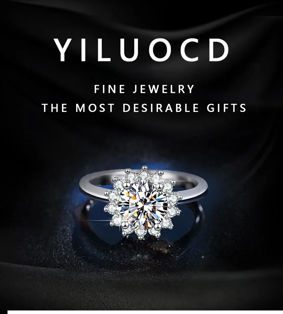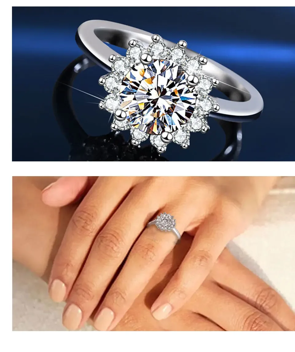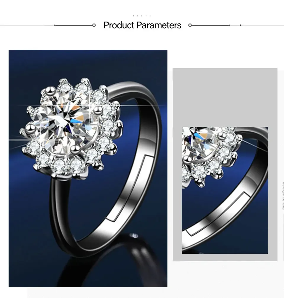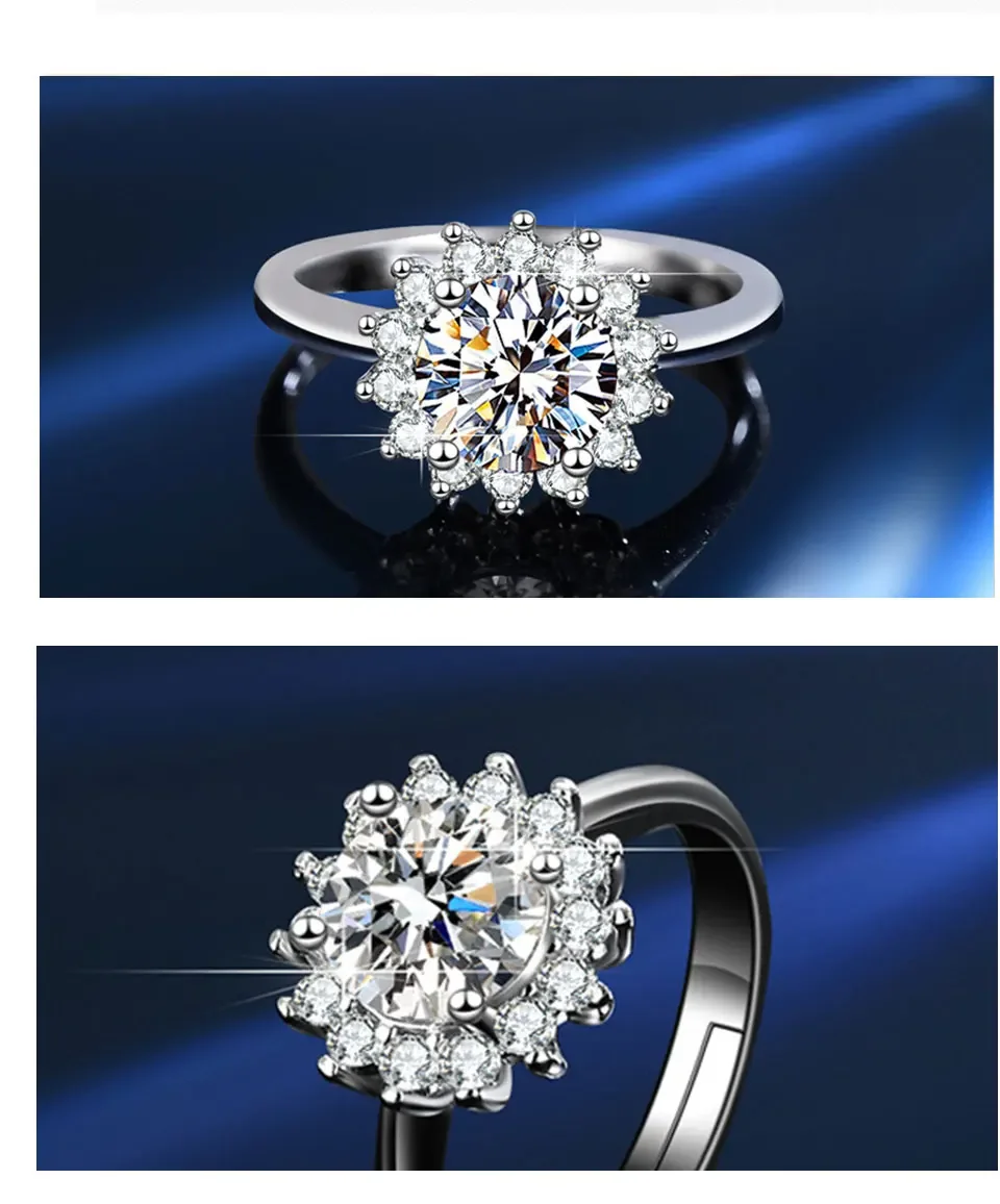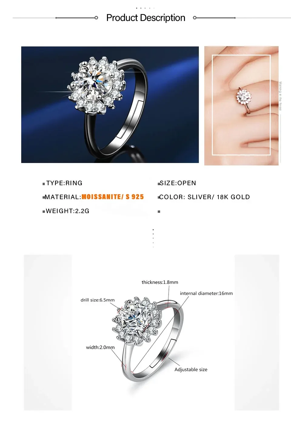 Luxury 100% Real 1CT Moissanite Diamond Sun Flower Rings for Women 925 Sterling Silver Adjustable Sparkling Rings Fine Jewelry
