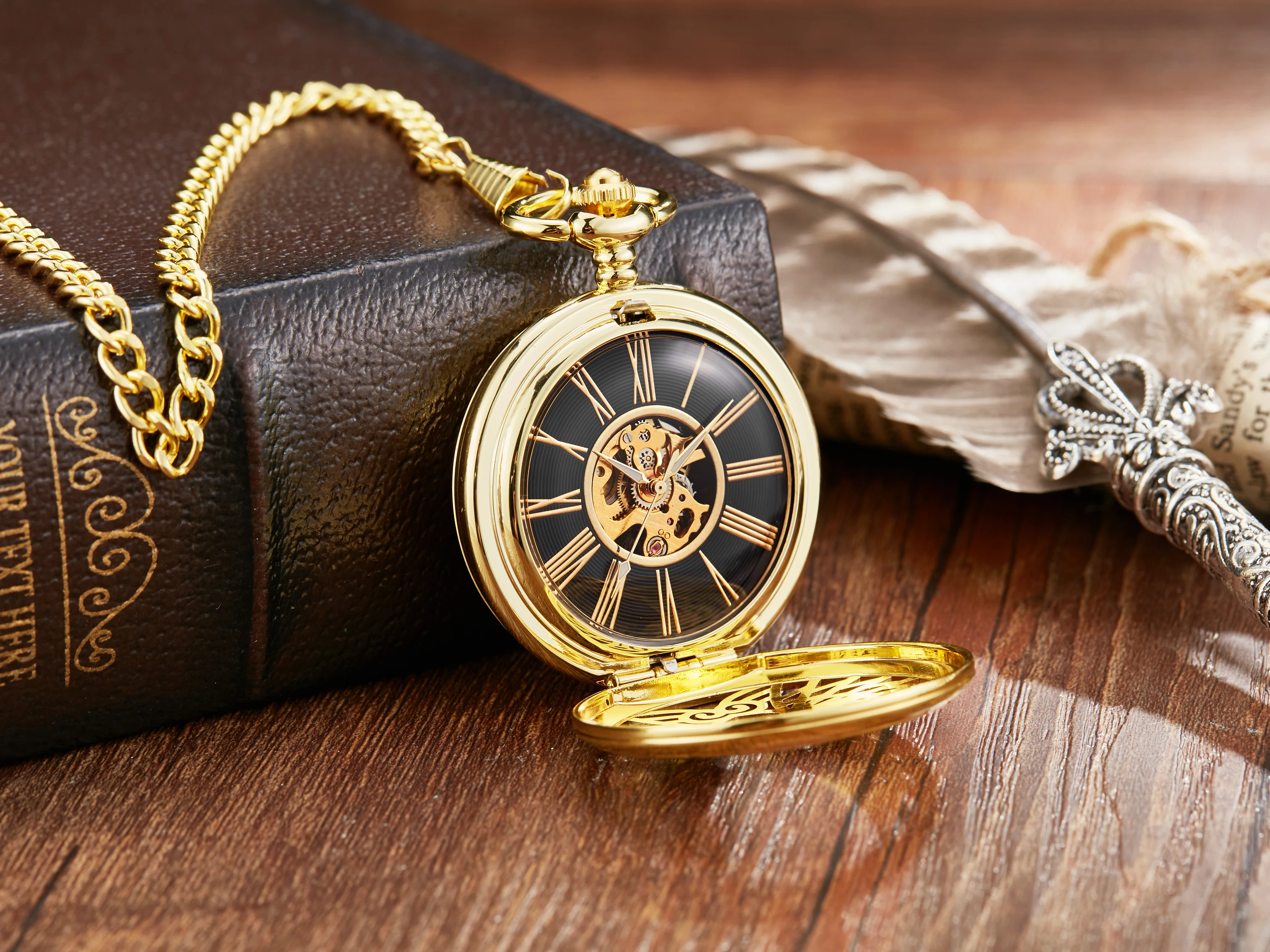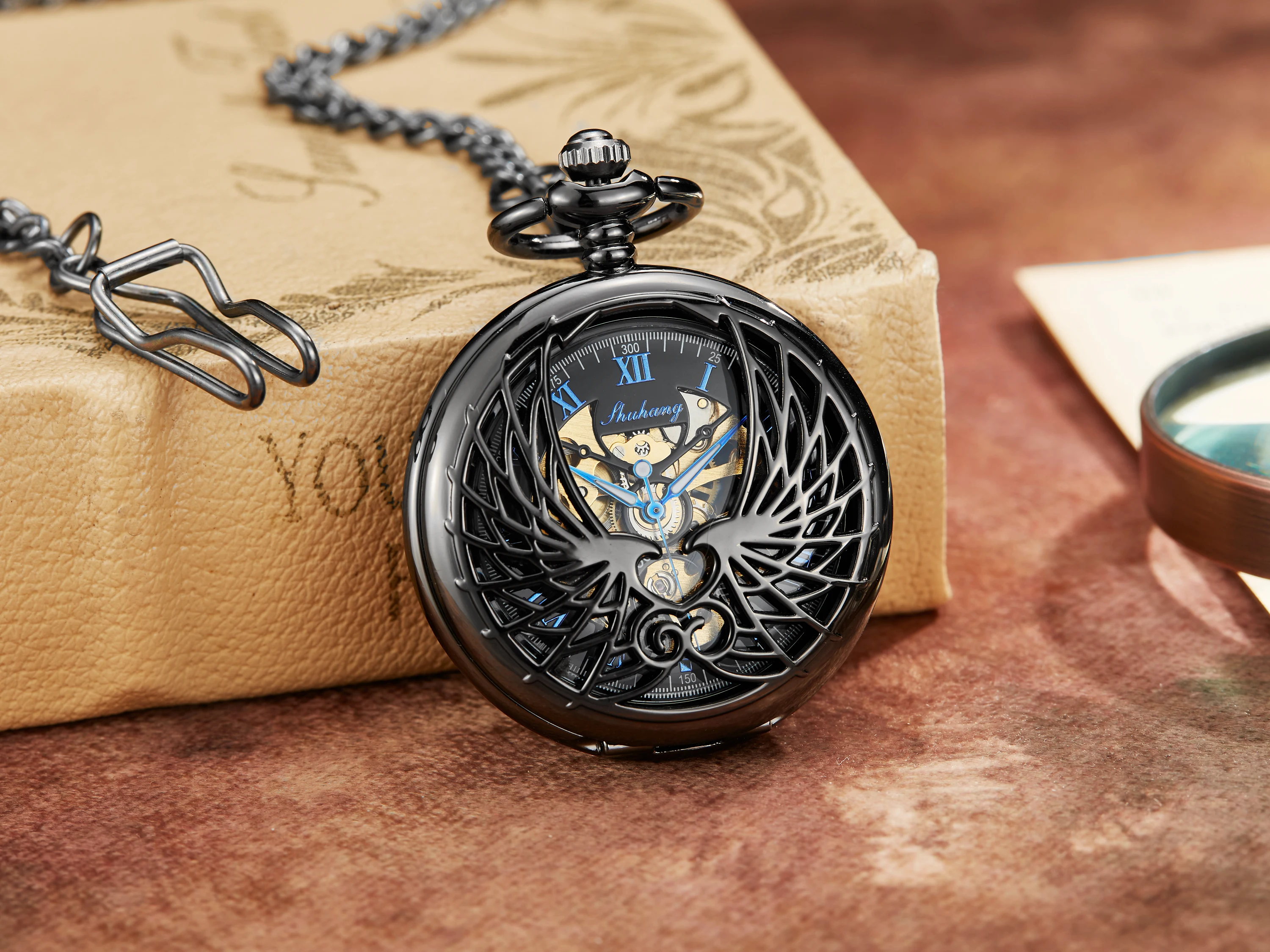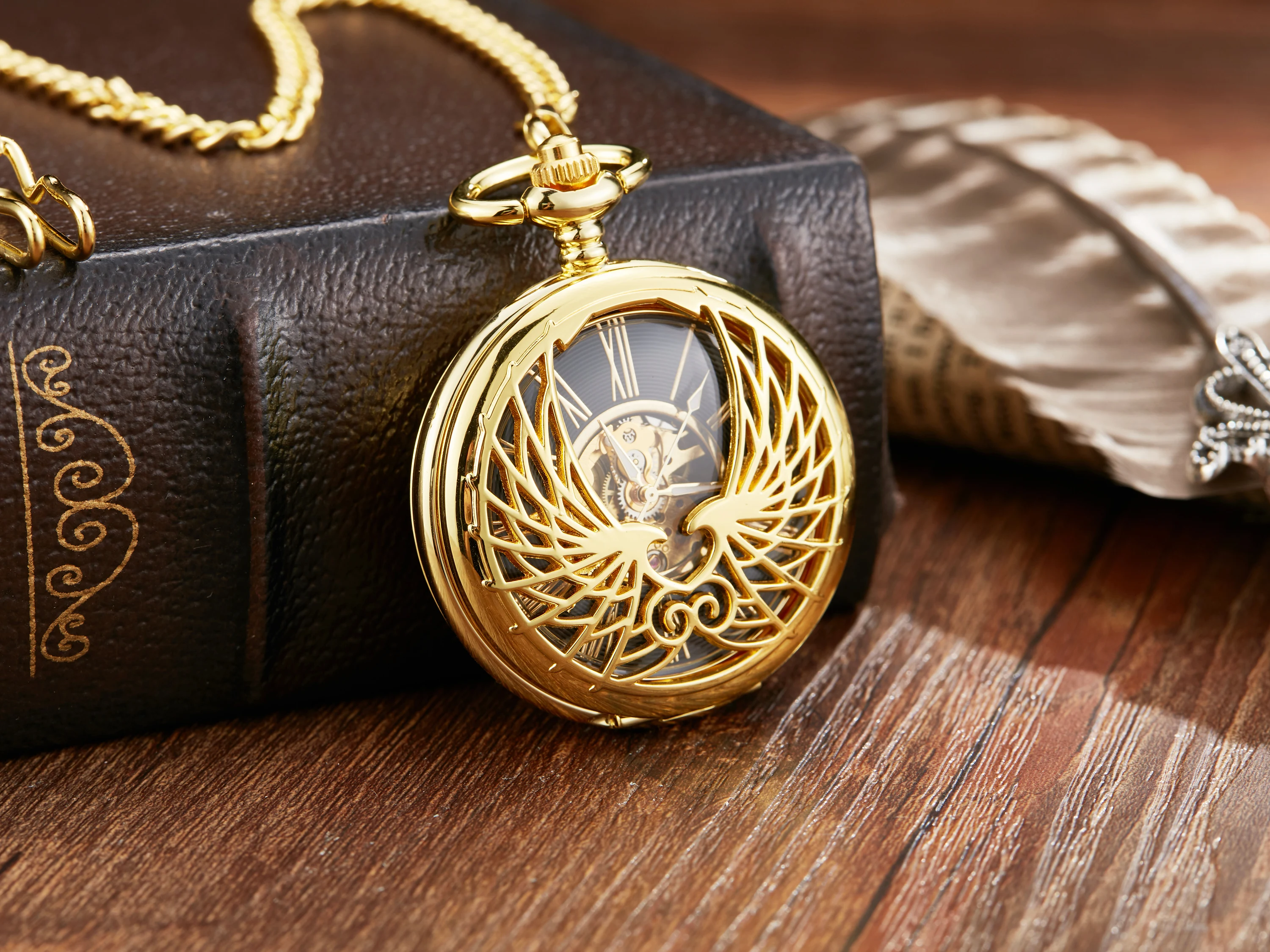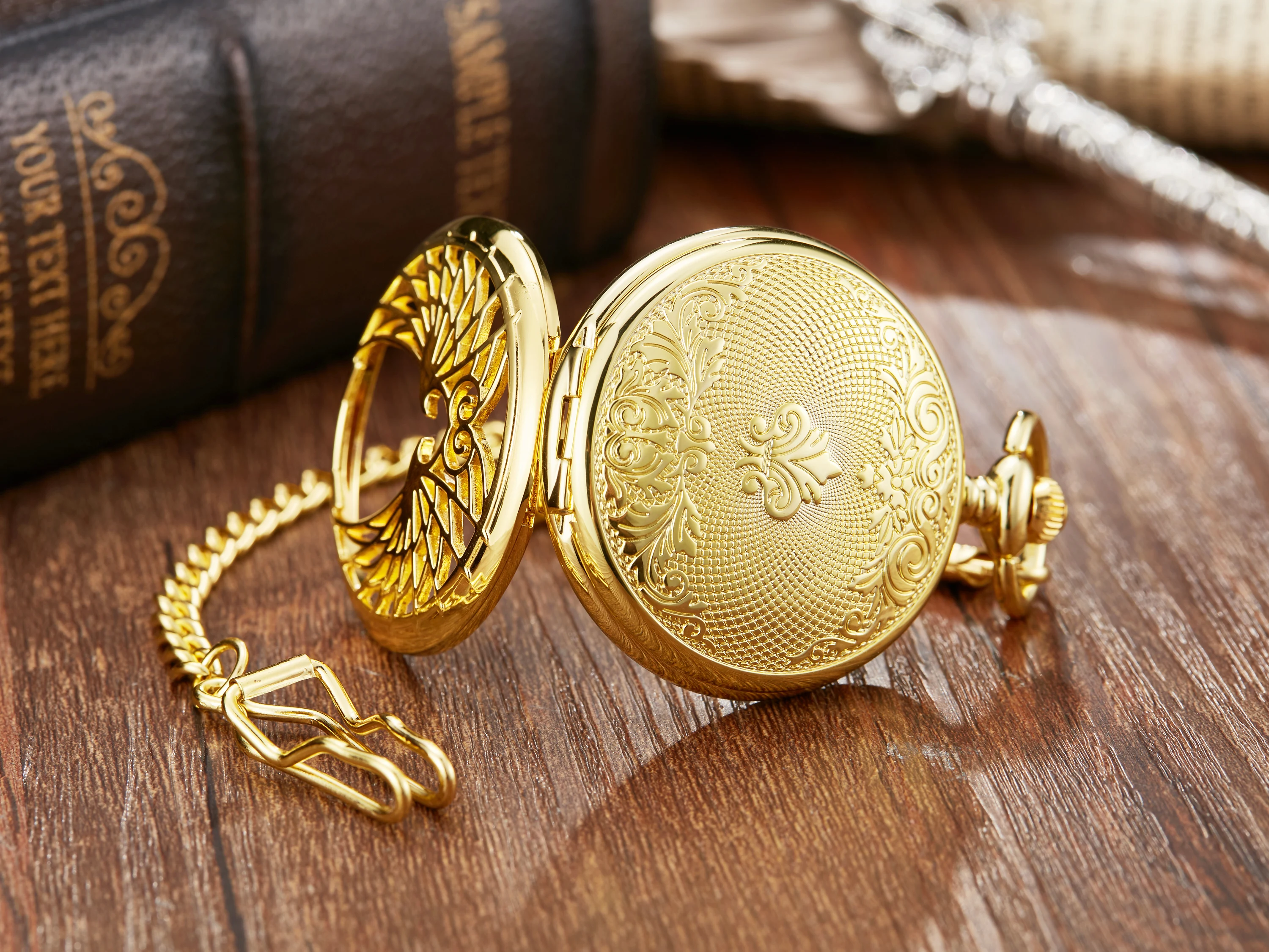 Luxury Golden Love Wings Mechanical Pocket Watch Men Women Necklace Pendant Unique Hollow Design Skull Double sided Chain
