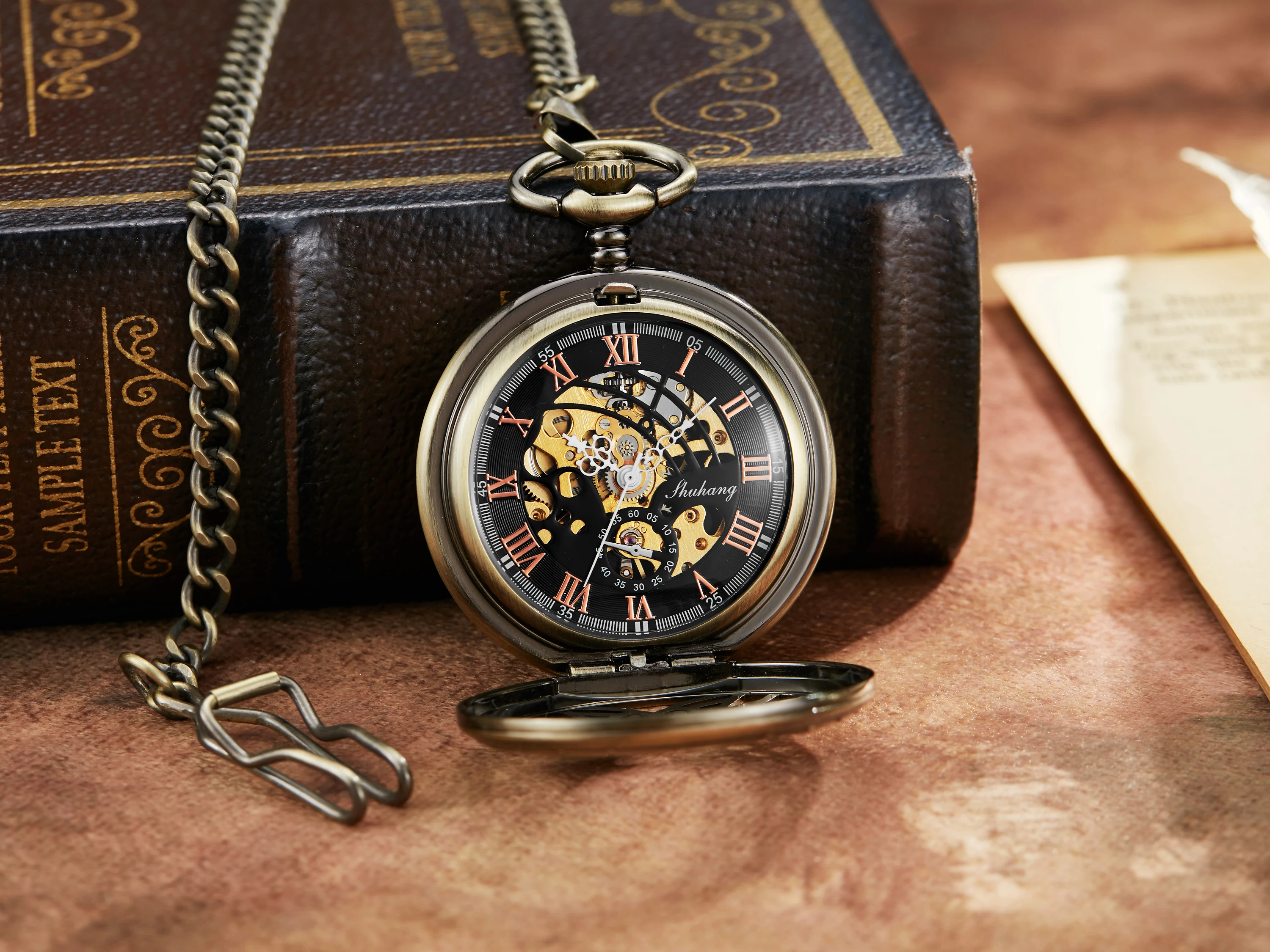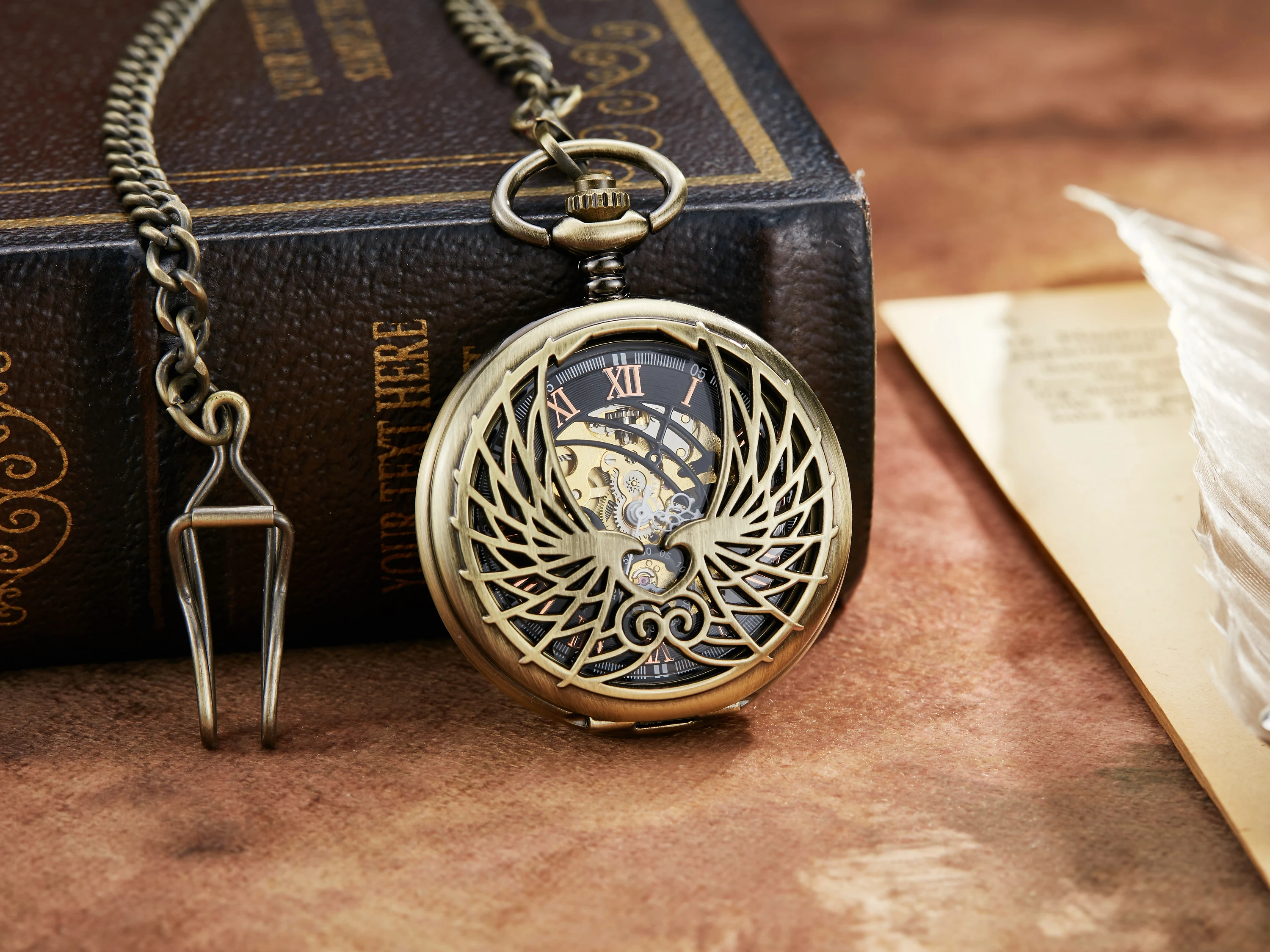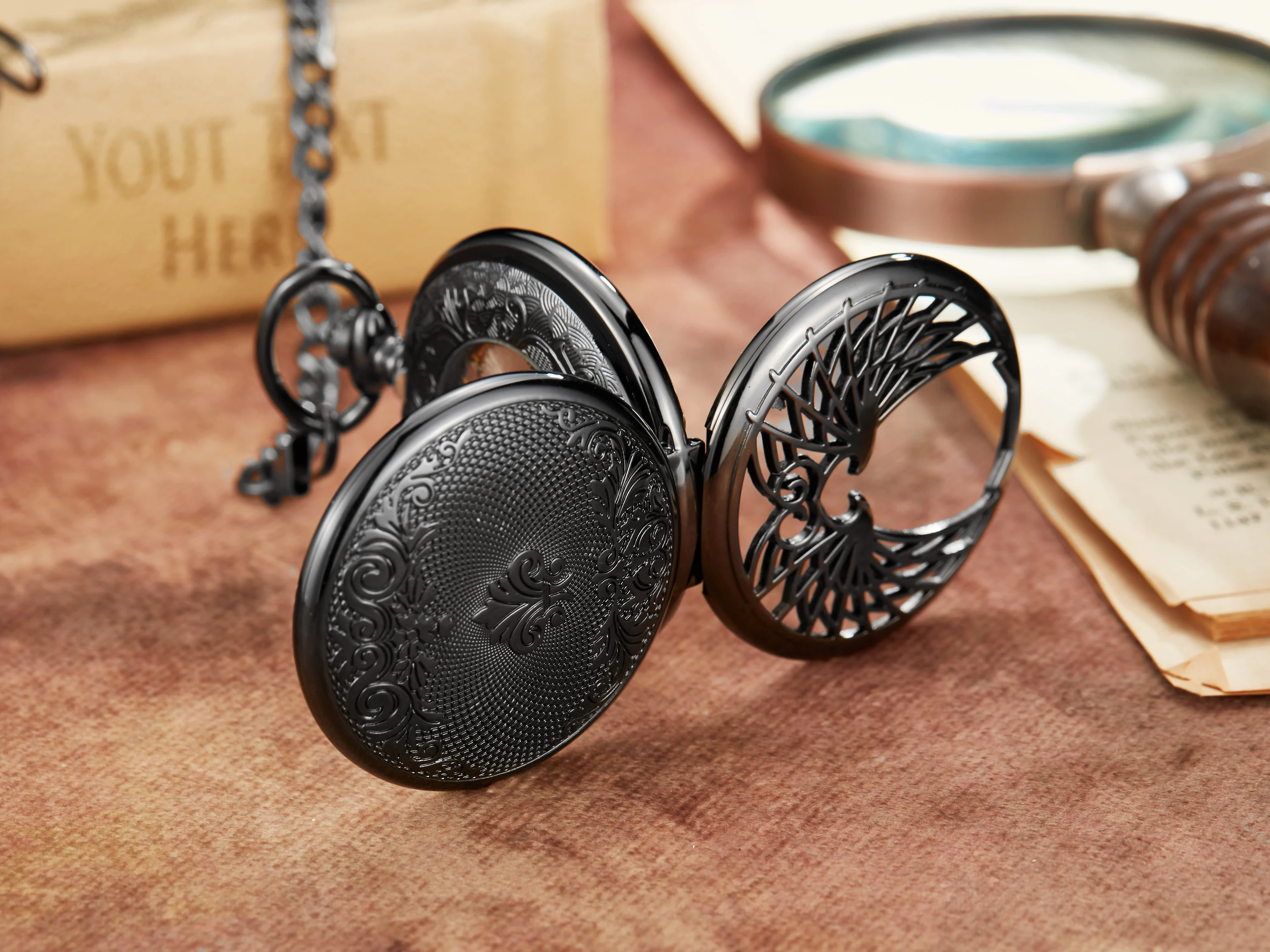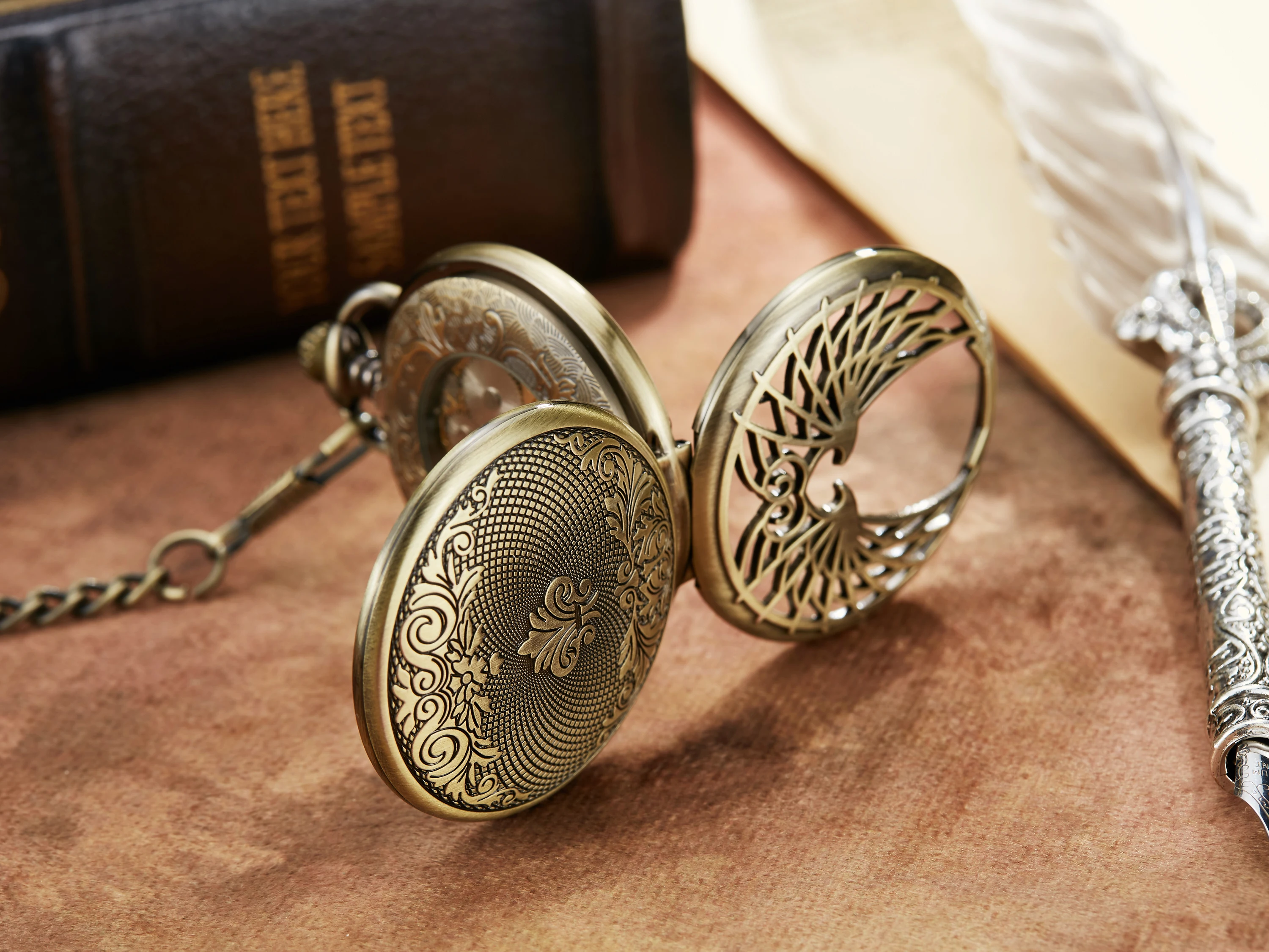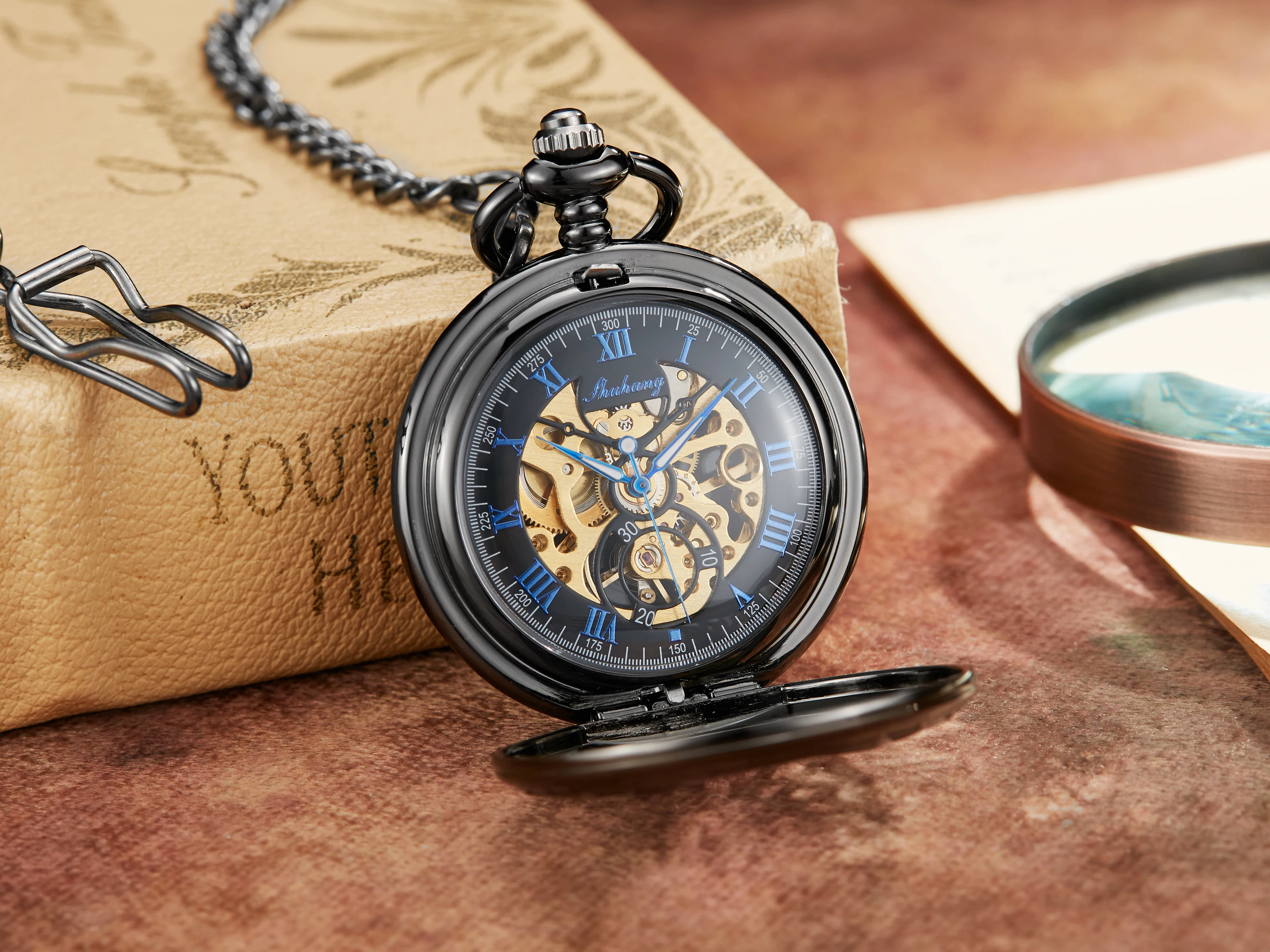 Luxury Golden Love Wings Mechanical Pocket Watch Men Women Necklace Pendant Unique Hollow Design Skull Double sided Chain