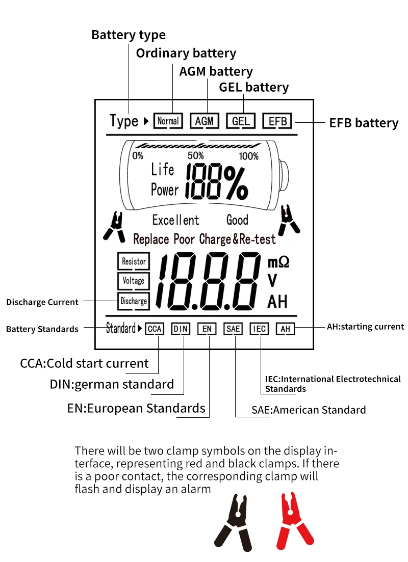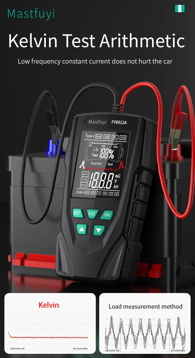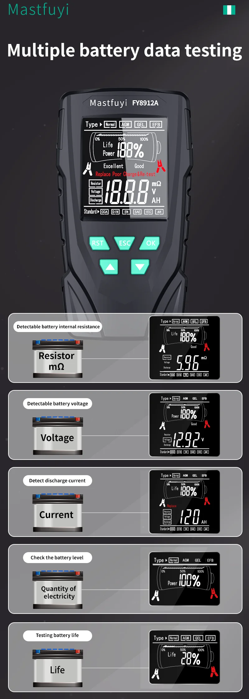 MASTFUYI 12V/24V Car Battery Tester Automatically Measure Battery Life and Capacity Visualize Battery Status Plug & Play