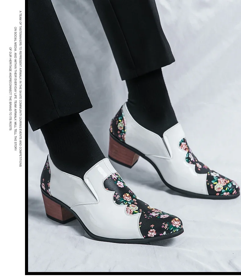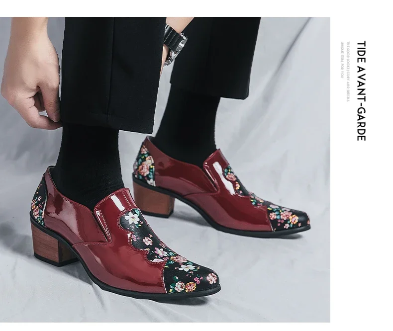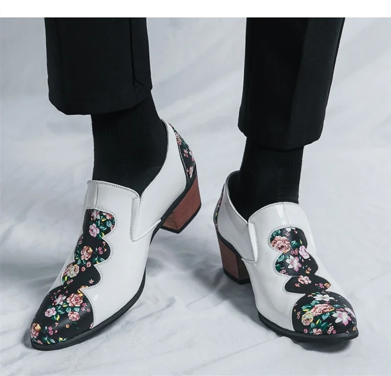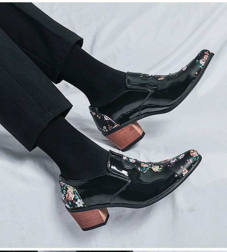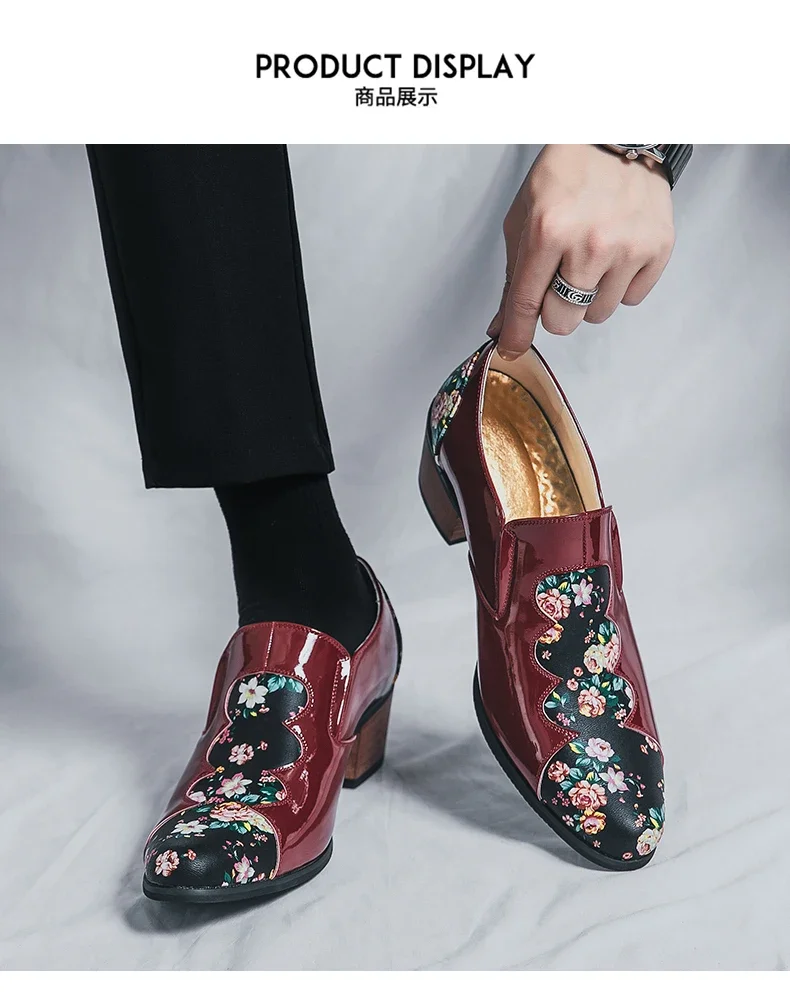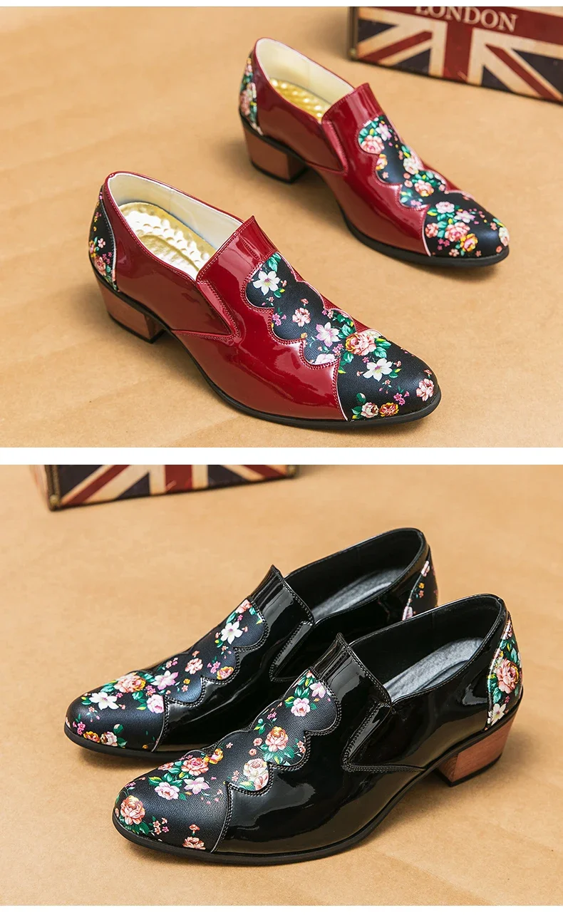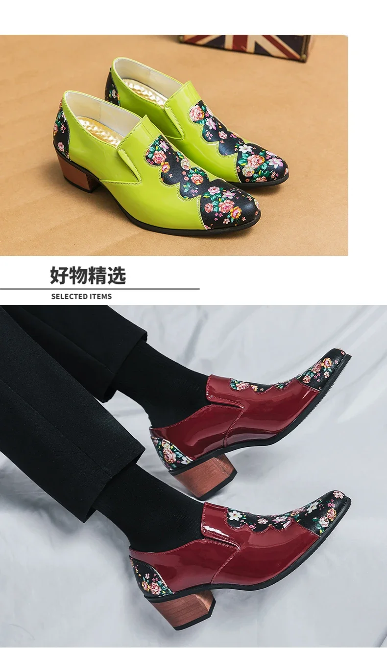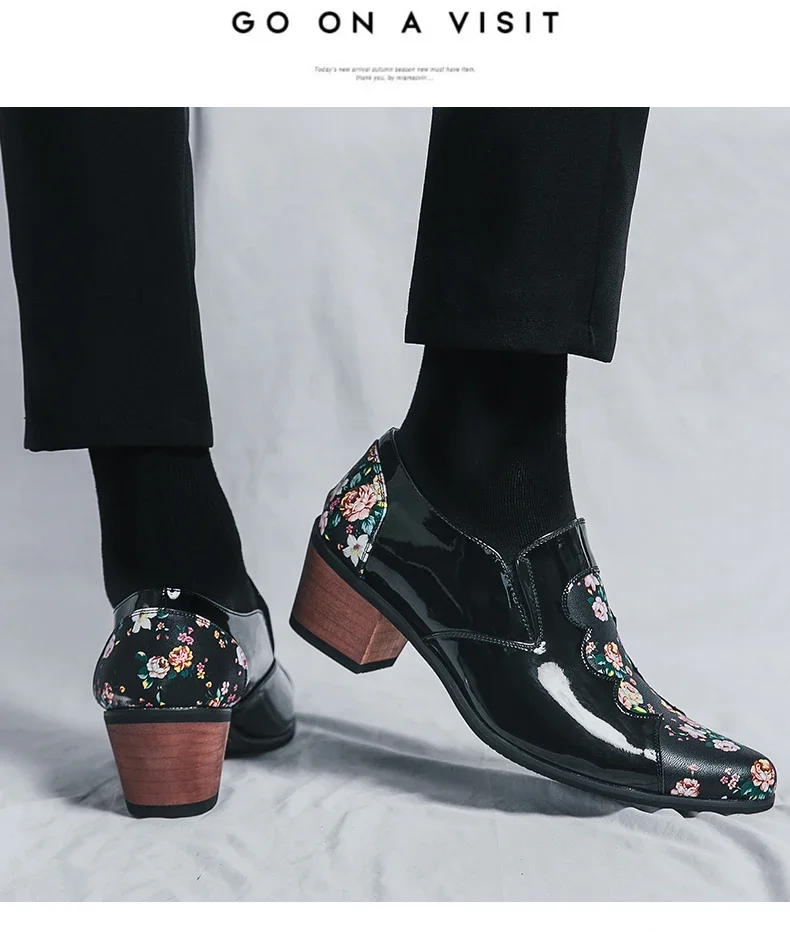 Men Fashion Embroidery High Heel 6cm Patent Leather Pointed Oxfords Shoes Flower Pattern Comfort Party Wedding Men’s Dress Shoes