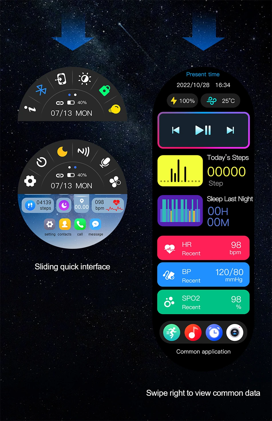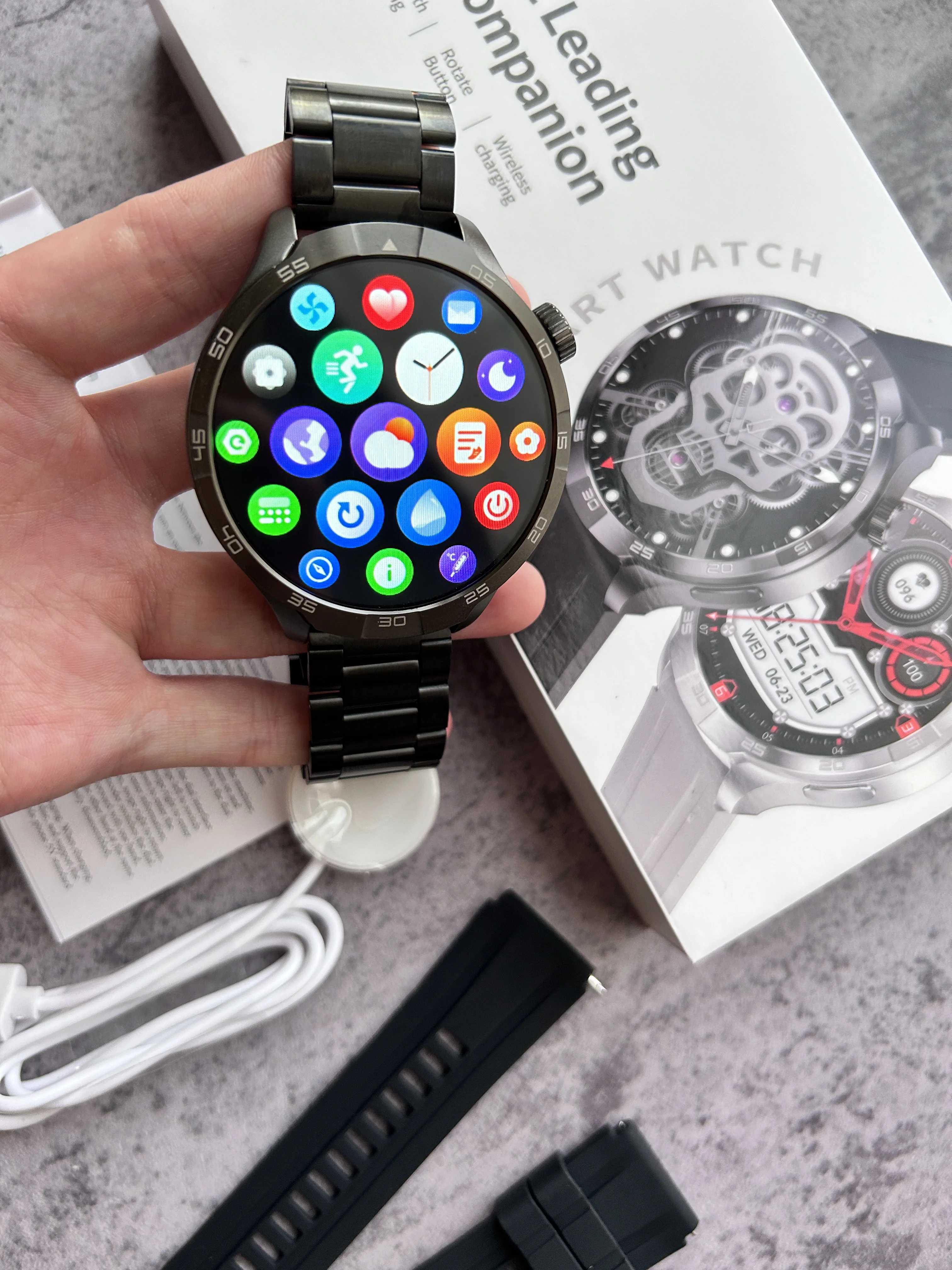 Basic functions: Compass, phone (contacts, call records, dial keypad, call Settings, SOS), message push, exercise, step counting, sleep detection, music, heart rate, blood pressure, blood oxygen, body temperature, women’s health detection, medicine reminder, water reminder, sedentary reminder, style switch, calendar, voice assistant, weather, photo, calculator, breathing, my QR code, timer, Find your phone, stopwatch, motion track, alarm clock,NFC