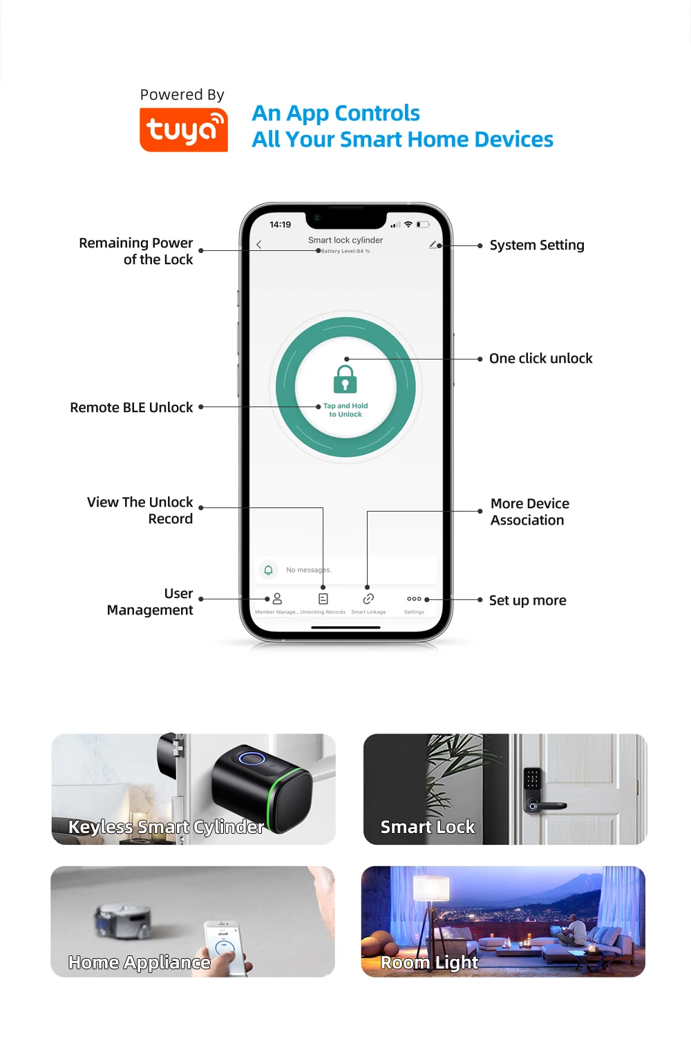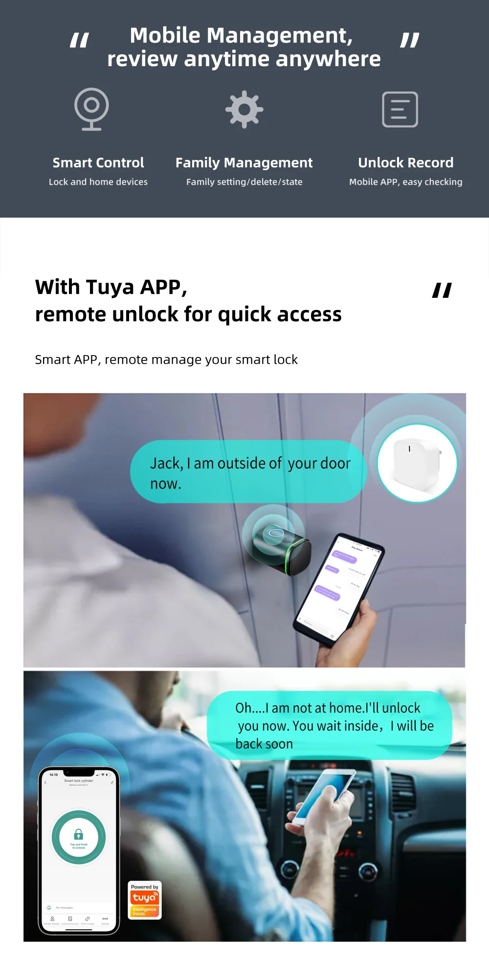• Tuya APP Management: Remote control of the door lock anytime, anywhere, and view lock records.