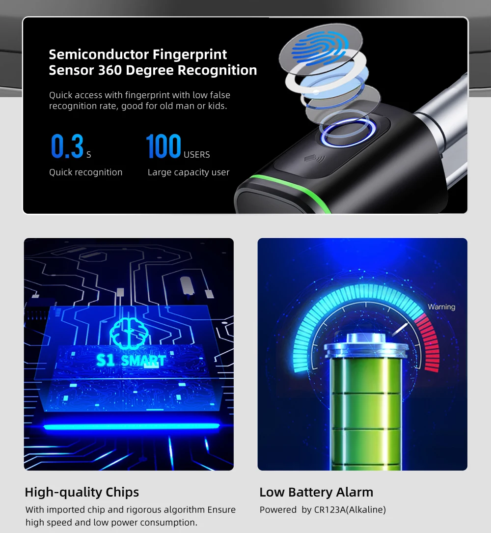 • High Security Standards: Grade C lock core, semiconductor fingerprint recognition, 360-degree all-around recognition.