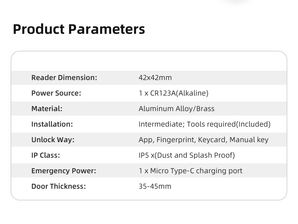 • Unlocking Methods: App, fingerprint, IC card, mechanical key