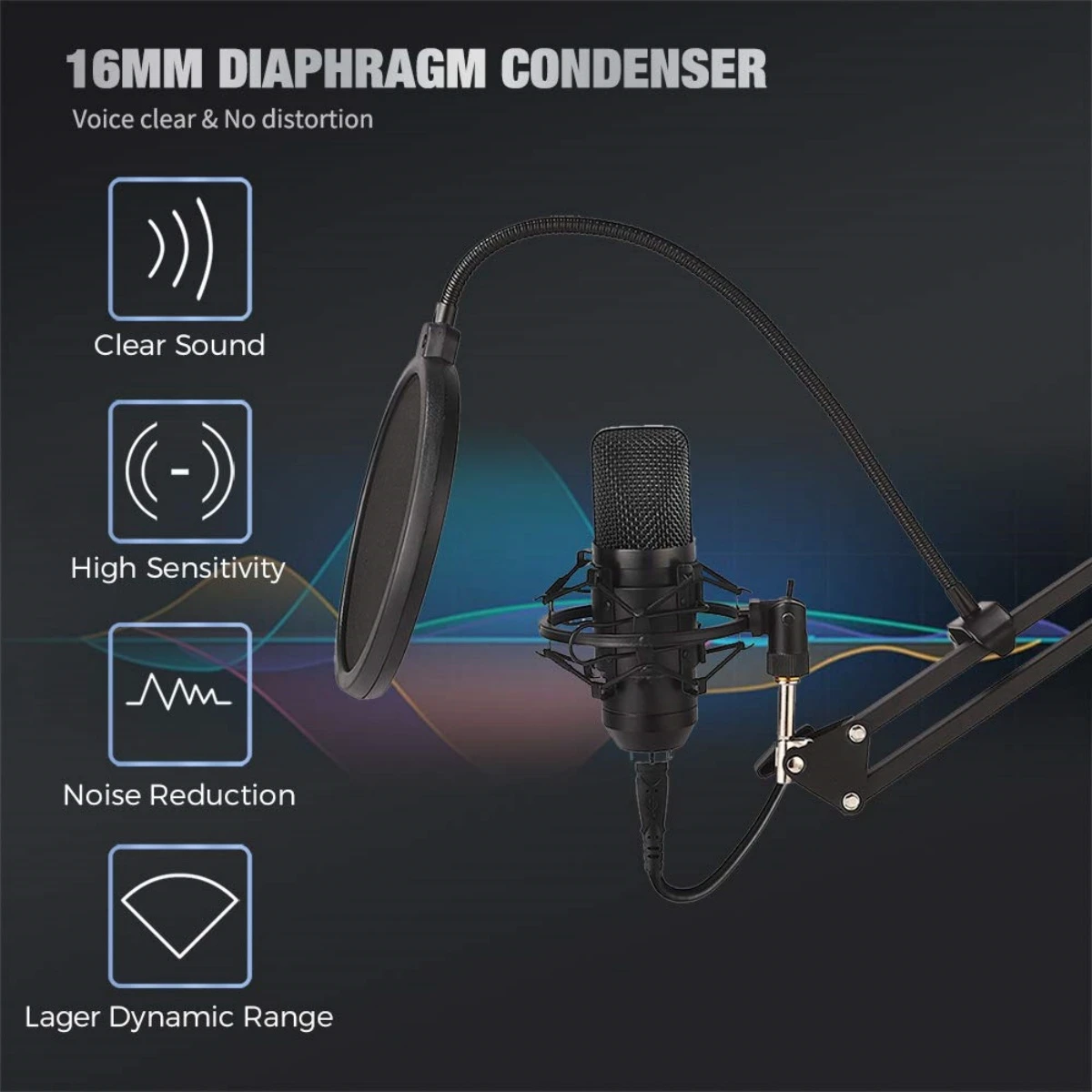 • Professional Condenser Mic Kit :This kit features a professional condenser microphone, perfect for recording high-quality audio in professional settings.