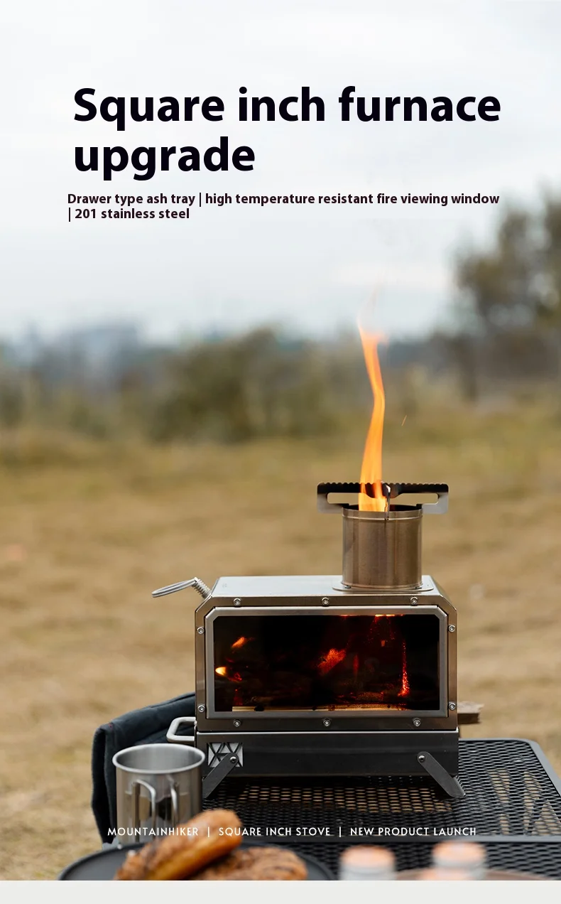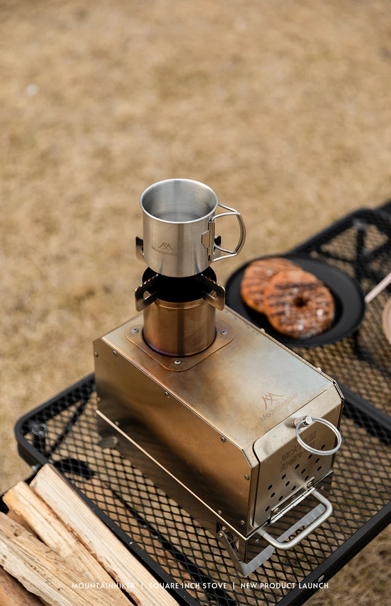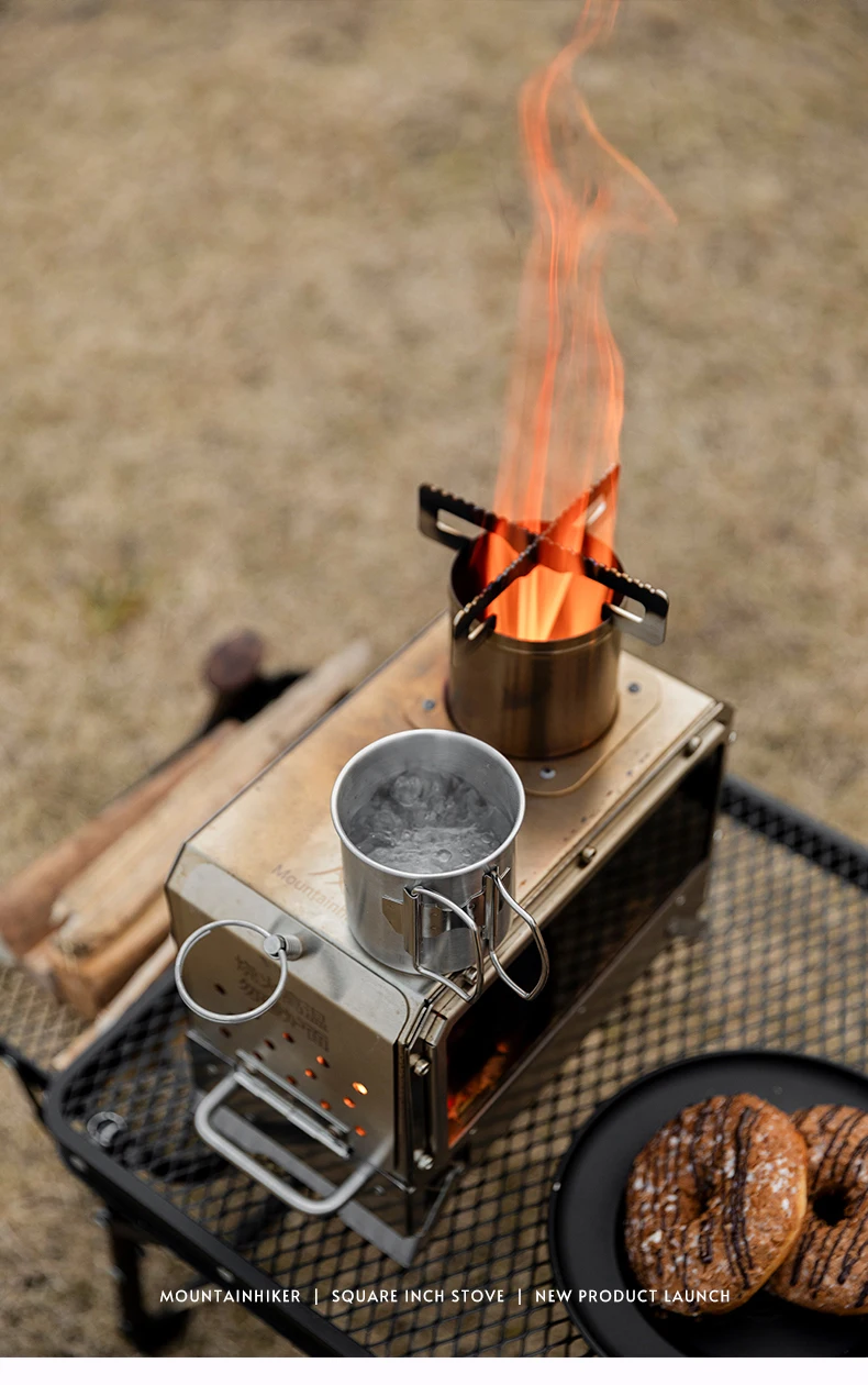 Mountainhiker camping, wood stove, tent boiling water, surrounding fireplace, square inch stove, folding stove, heating stove