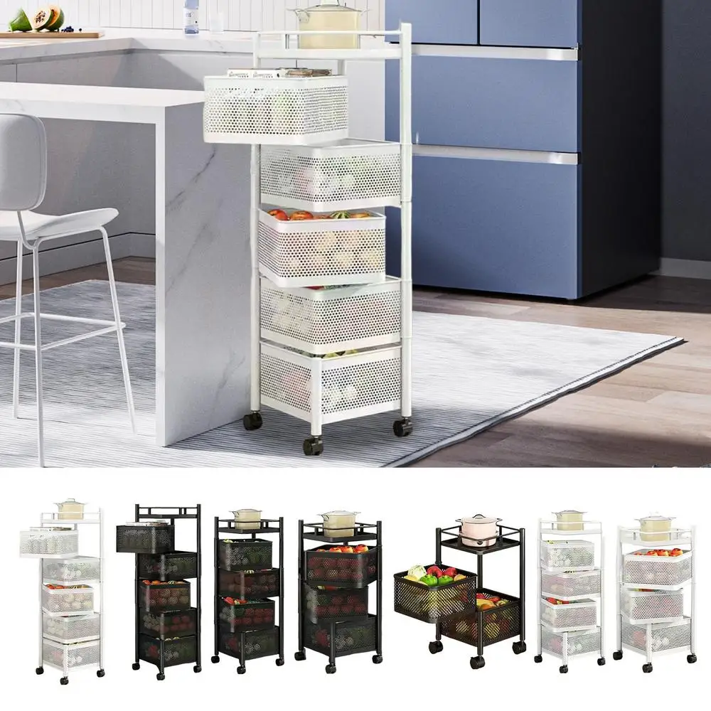 3.Convenient Mobility: Maximize the space in your kitchen with our rotating storage rack on wheels. Its vegetable baskets simplify accessibility and practical performance, while its mobility and easy-to-clean design make it a convenient addition to any culinary space.