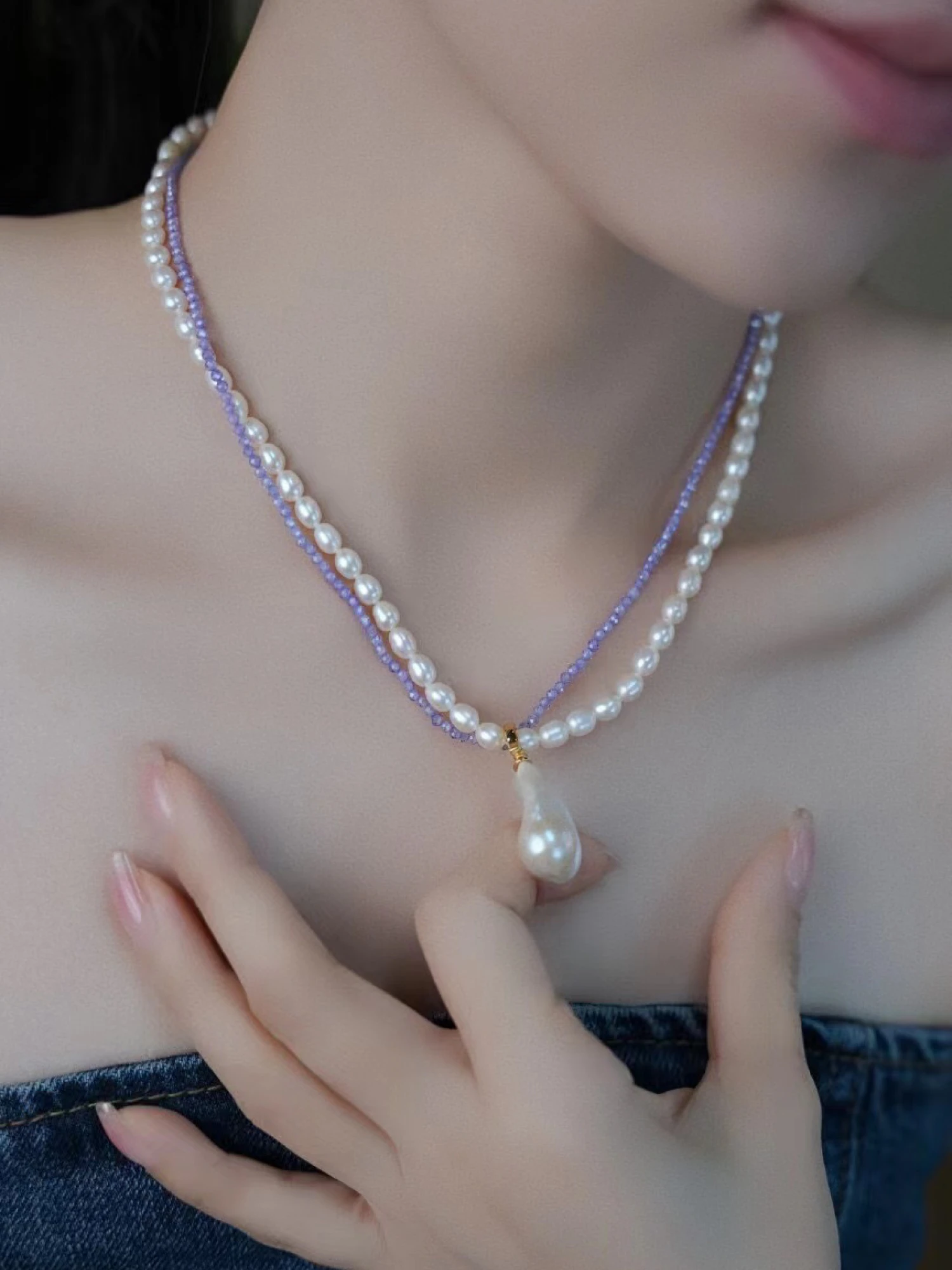 Perfect for any occasion, this layered necklace effortlessly transitions from casual daywear to elegant evening attire. The combination of amethyst, freshwater pearls, and the unique baroque pearl pendant makes it a standout piece that complements any style.