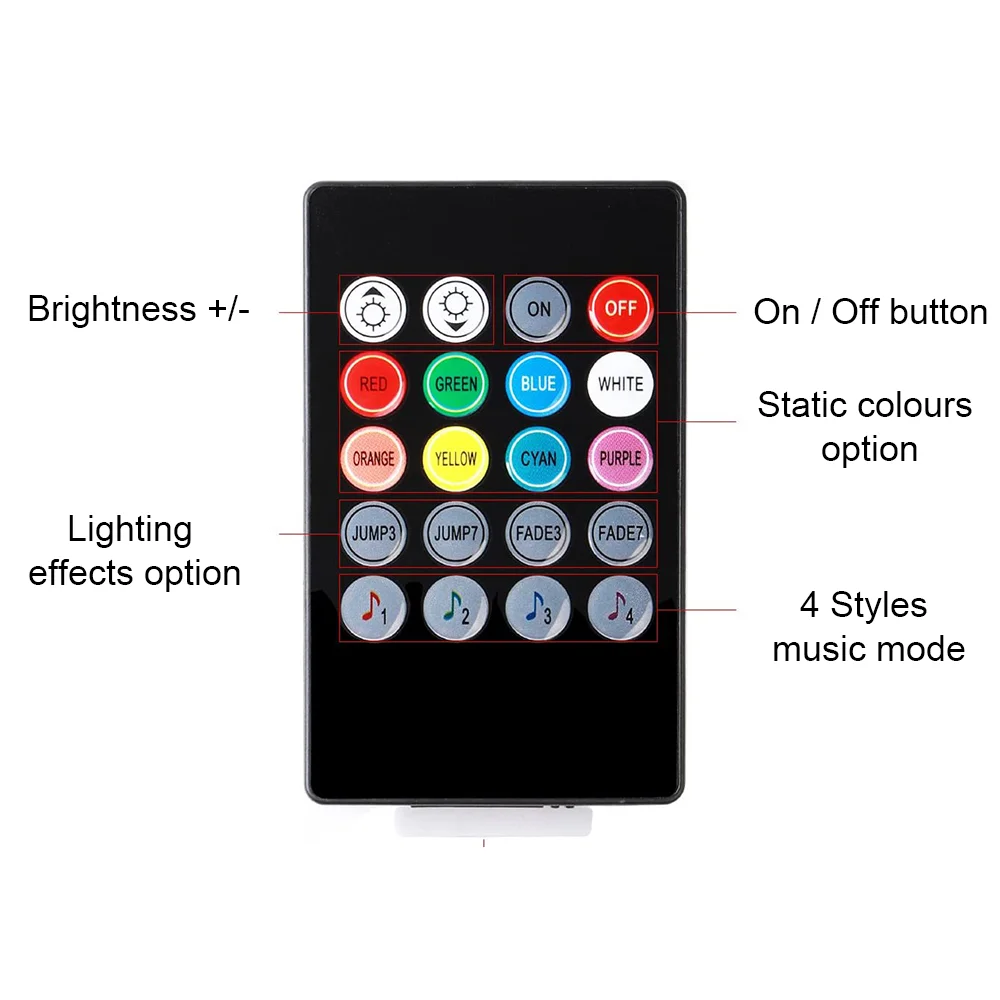 Control mode: 4 Music control mode, 8 signal color control, brightness control, ON/OFF, 2-segment jump mode control, fade-in and fade-out mode control.