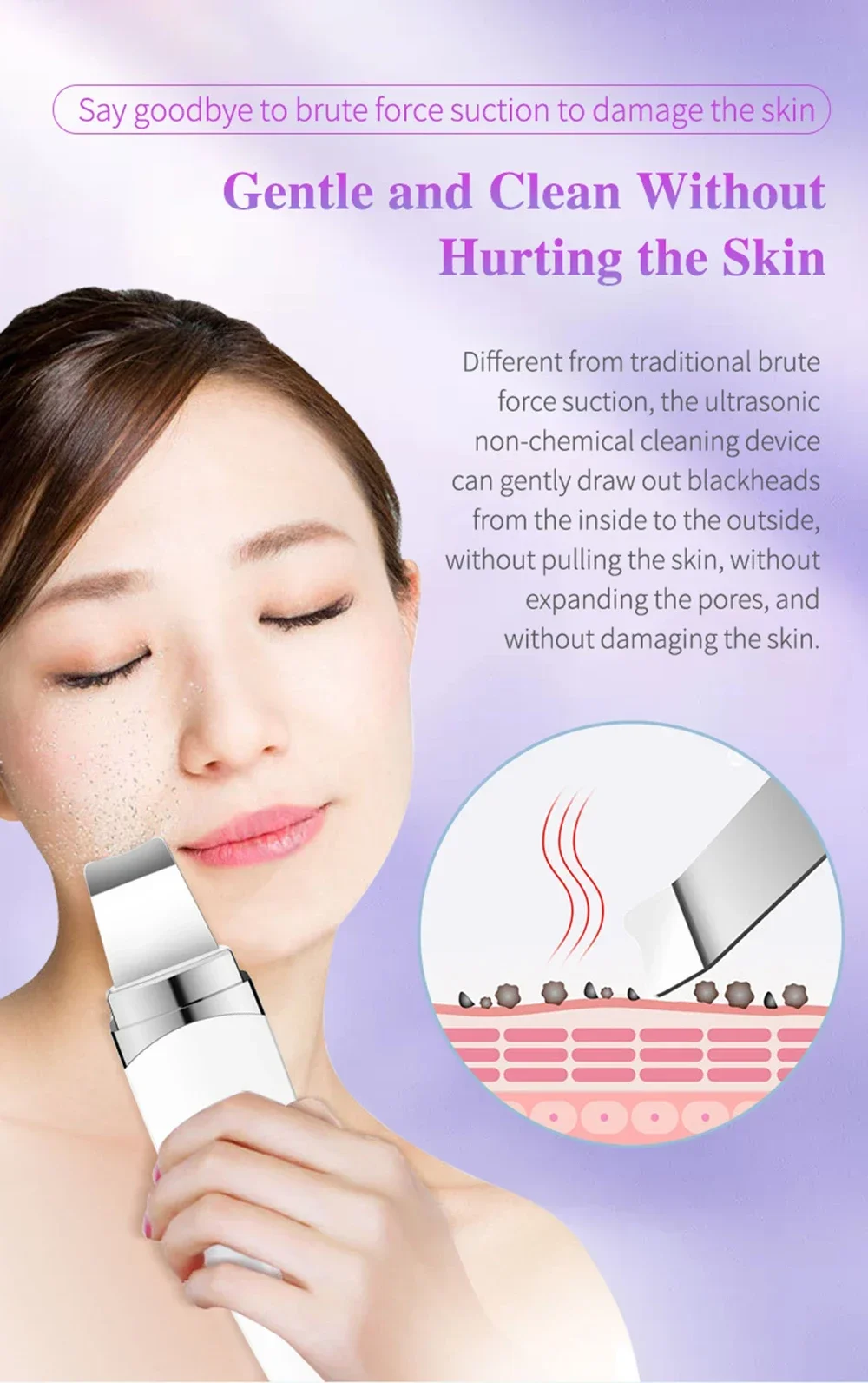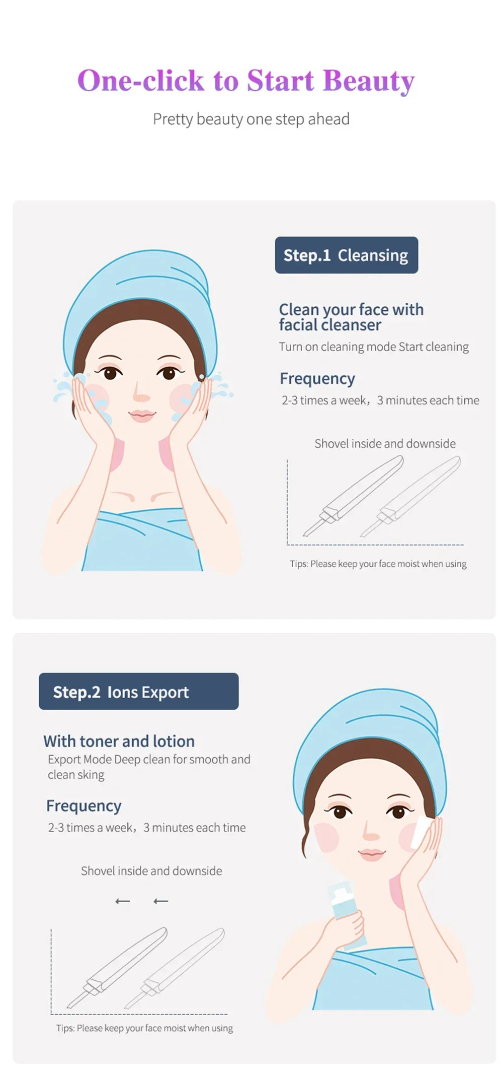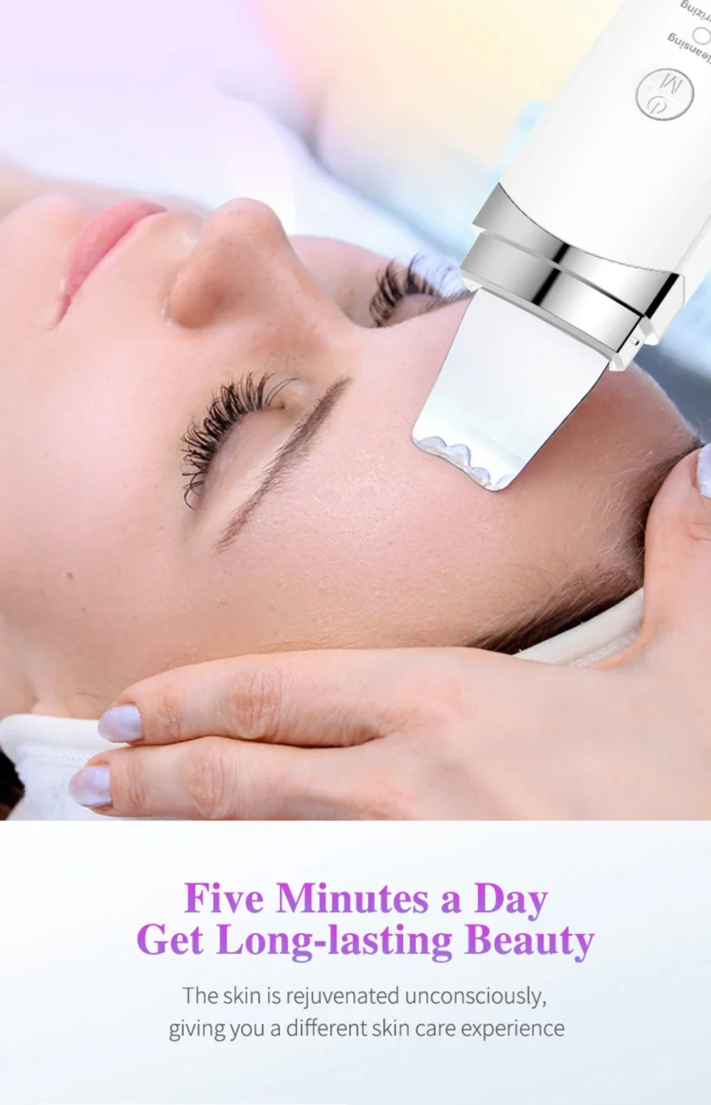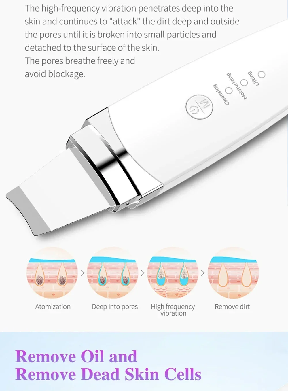 1.Deep cleansing: A way of 45 degree angle to accelerate the metabolism of epidermic cells and renew its normal upgrading rate, enhance the shedding of the aged and irregular aberrant cells, soften the keratin, reorder the epidermic cells while restoring the skin elasticity and reverting to a firm, smooth and delicate skin.