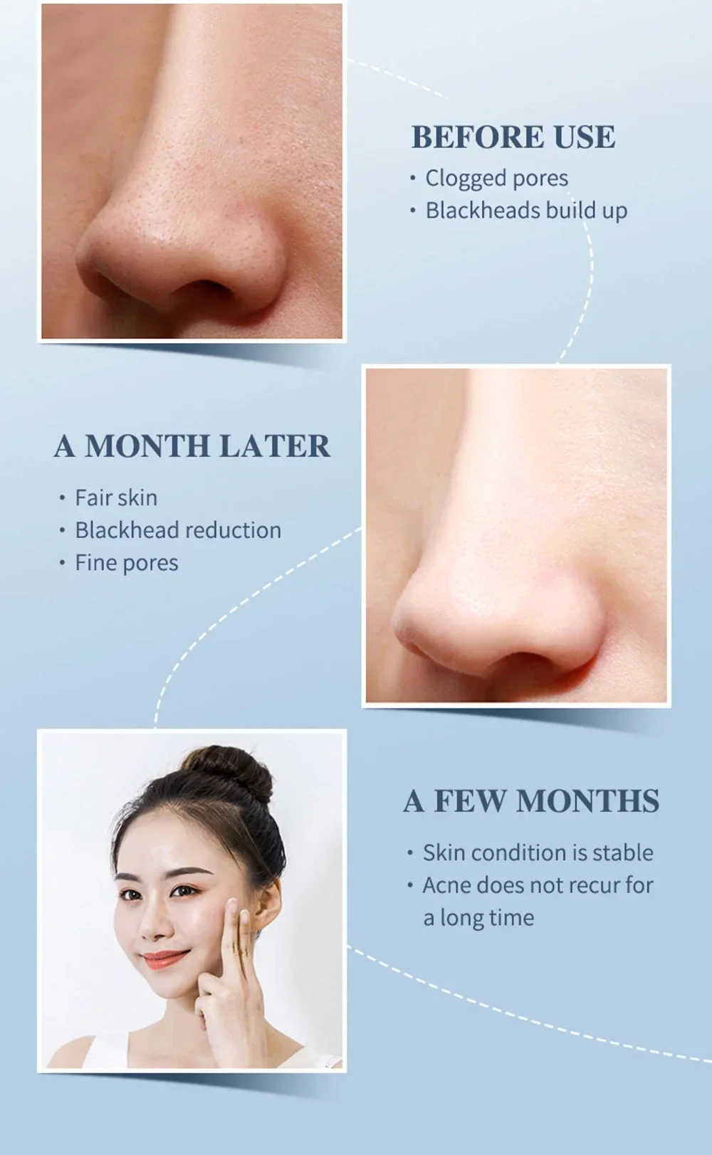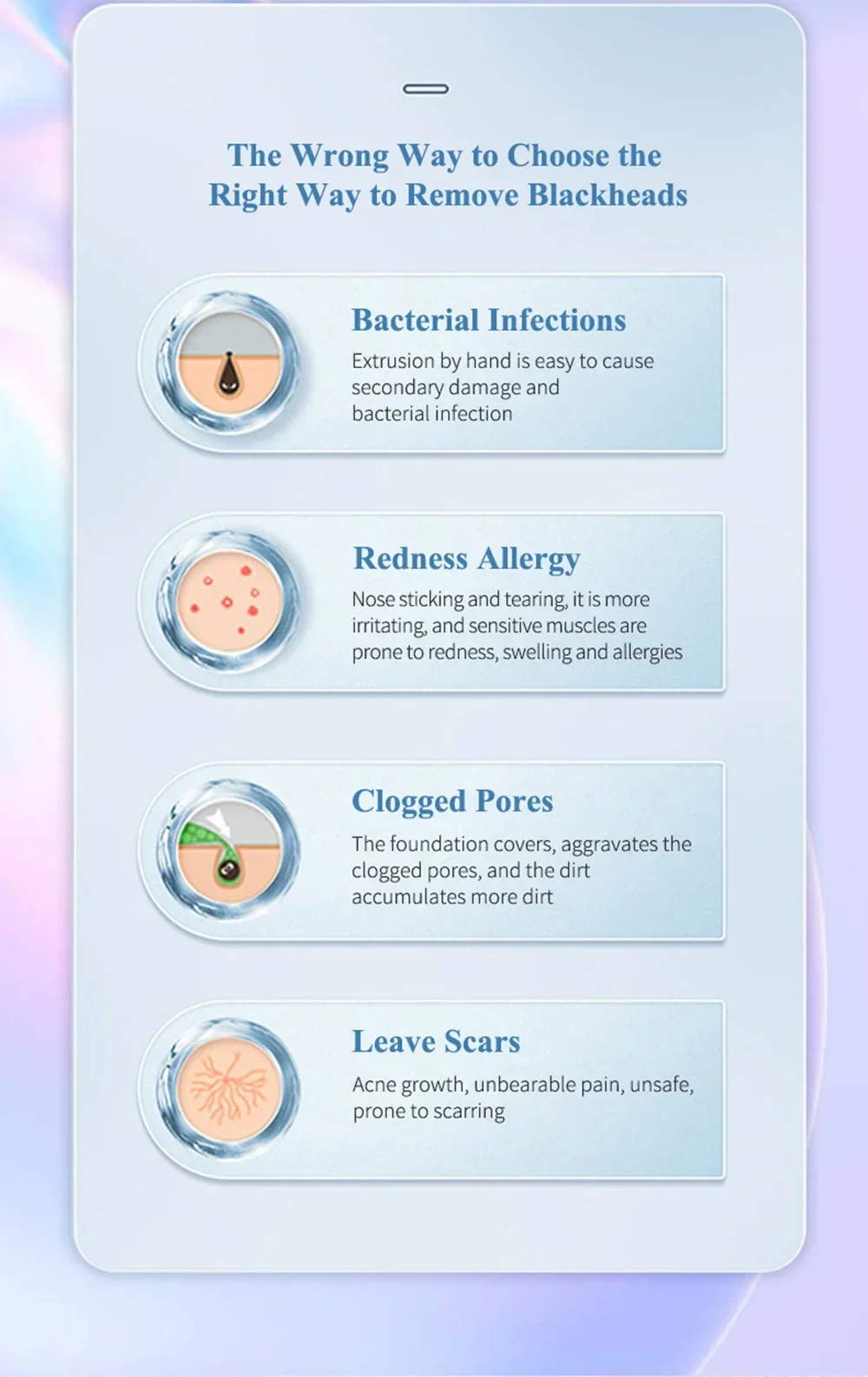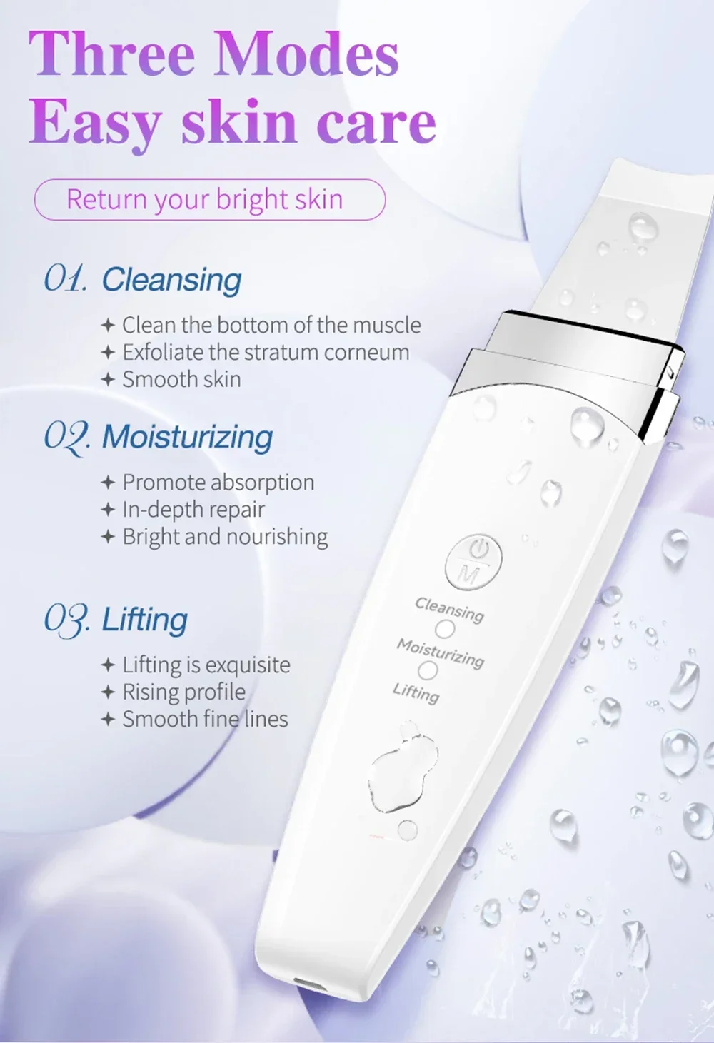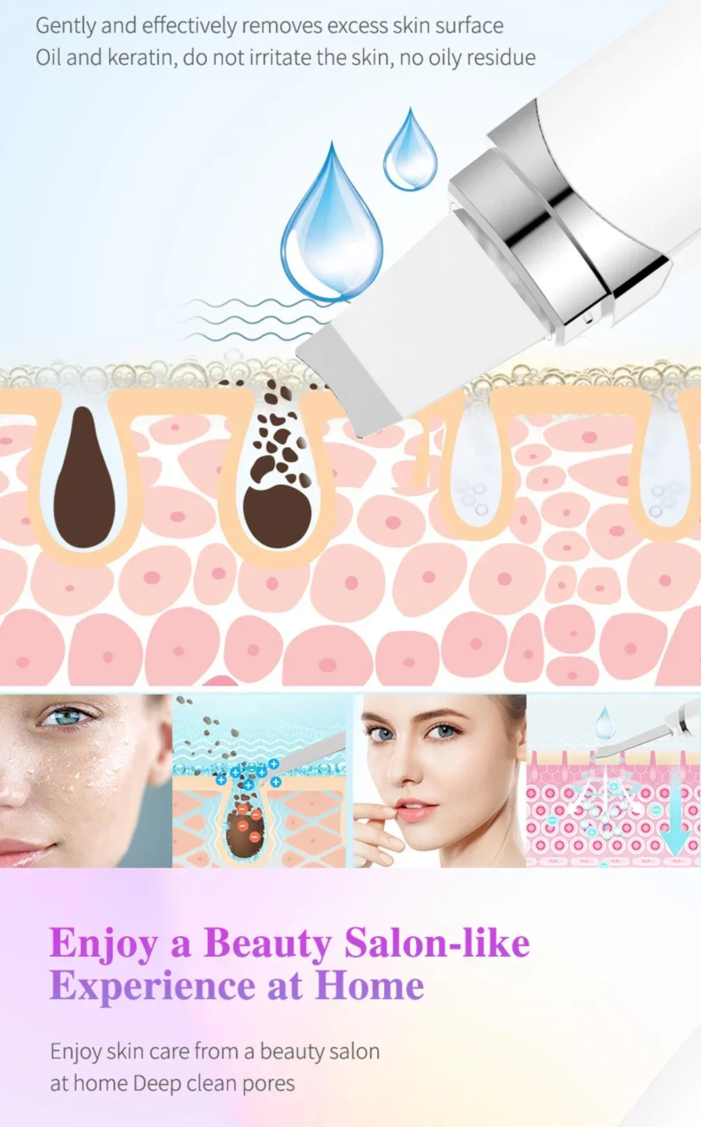 1.Deep cleansing: A way of 45 degree angle to accelerate the metabolism of epidermic cells and renew its normal upgrading rate, enhance the shedding of the aged and irregular aberrant cells, soften the keratin, reorder the epidermic cells while restoring the skin elasticity and reverting to a firm, smooth and delicate skin.