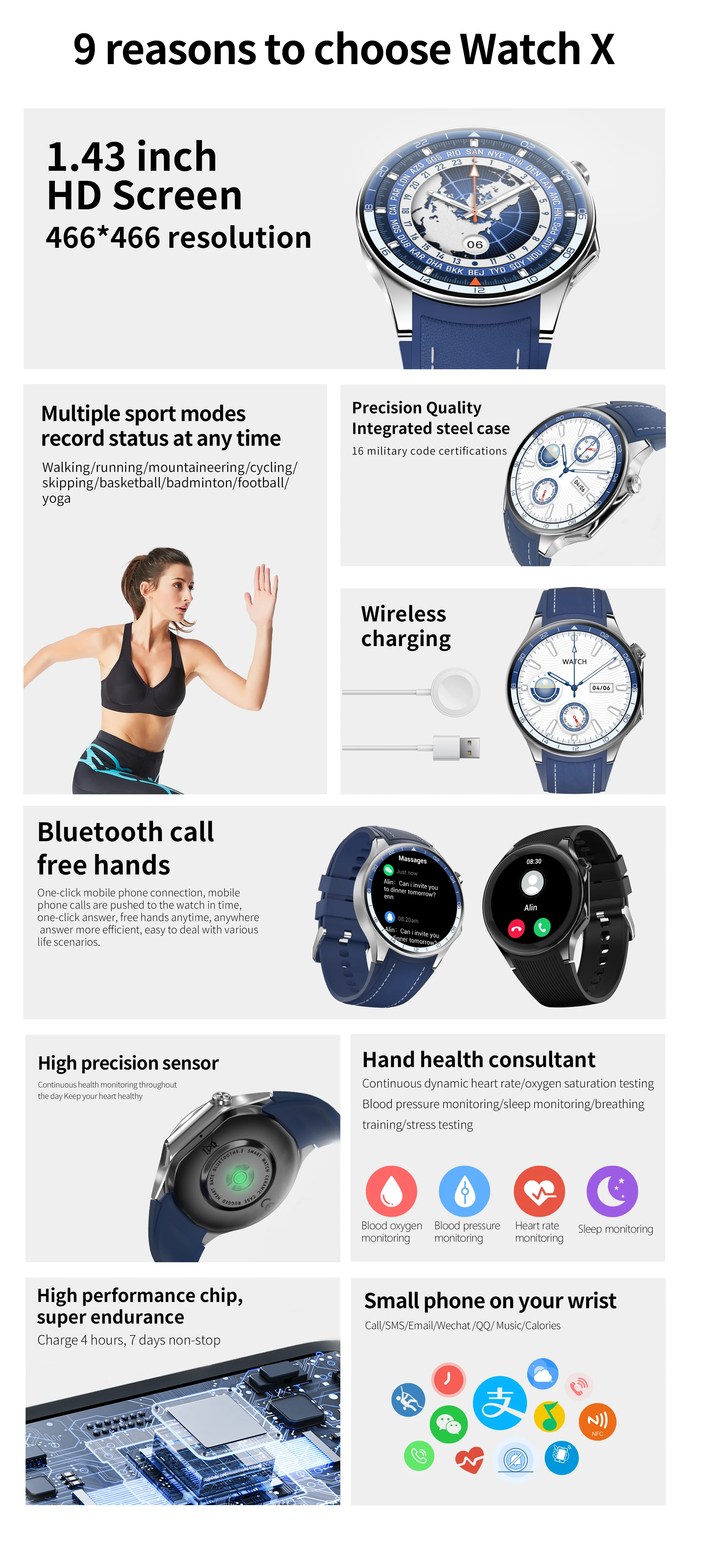 Breathing Training, Dial Push, Stopwatch, Brightness Adjustment, Multiple Exercise Modes, Sleep Tracking, Heart Rate Monitoring, App Notification, Remote Music Control, Remote Camera Control, Weather, Find My Phone (need to be connected to your phone), Bluetooth Calling, Bluetooth Music, Password Protection, Calculator, Split-Screen Display, Shortcut Widgets, Massage Function, My QR Code, Compass, Orientation Indicator, Recent Tasks Bar, 156 exercise algorithms, oximetry monitoring.