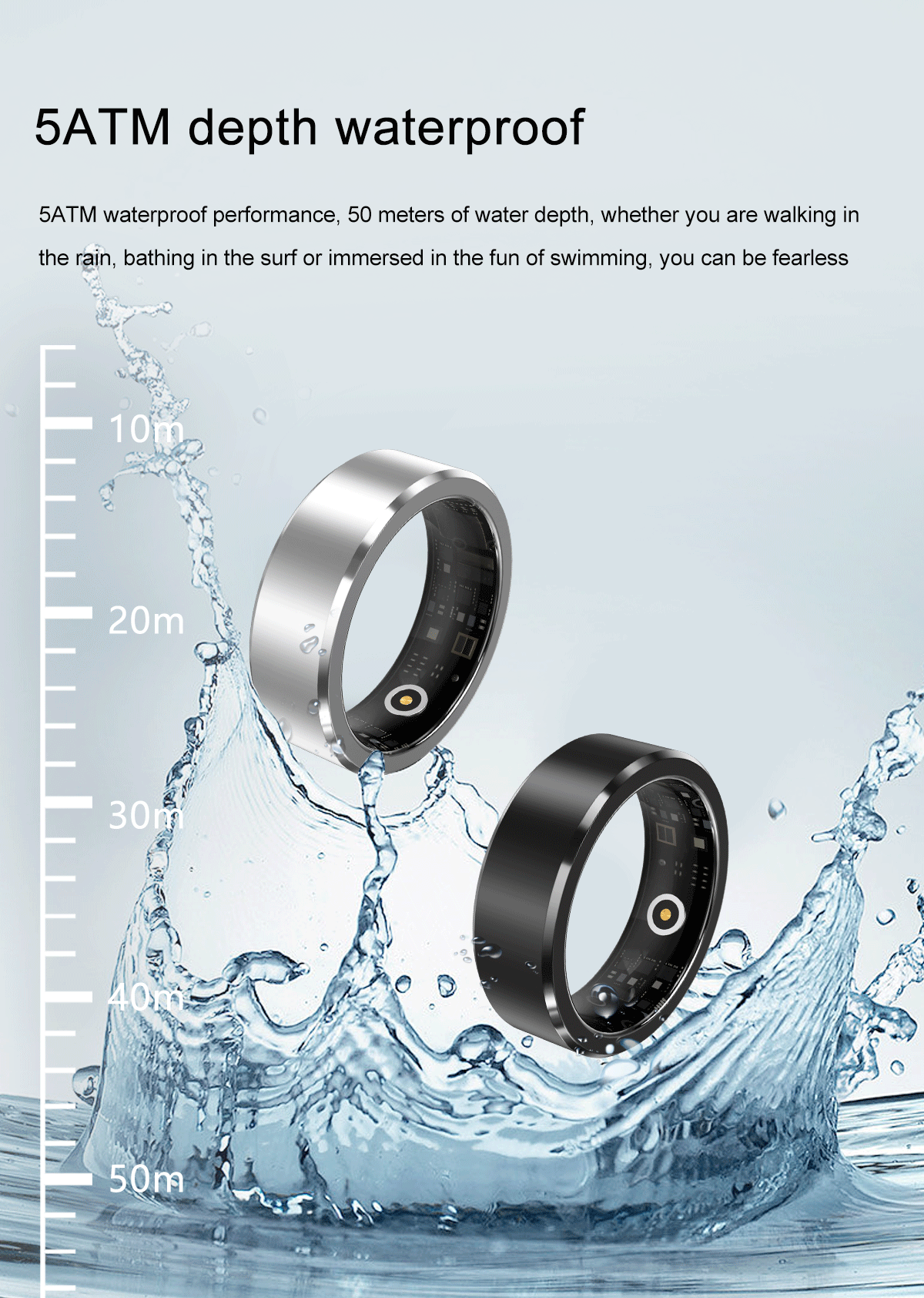 3. Fashionable and Durable Design: The smart ring health monitor doesn’t just offer functionality but also boasts a stylish design made from high-quality materials for all-day comfort. Its durable construction paired with waterproof technology allows you to stay connected outdoors, effortlessly handling daily water exposure such as swimming, handwashing, and rain, meeting all your waterproofing needs.