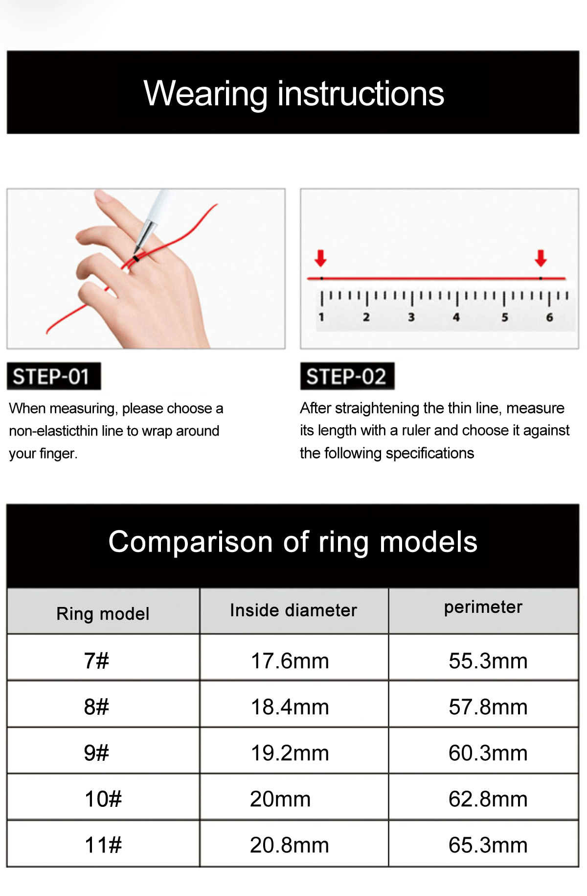 Ring size: 8 (inner diameter 18.1mm), 9 (inner diameter 18.9mm), 10 (inner diameter 19.8mm), 11 (inner diameter 20.6mm) (optional)