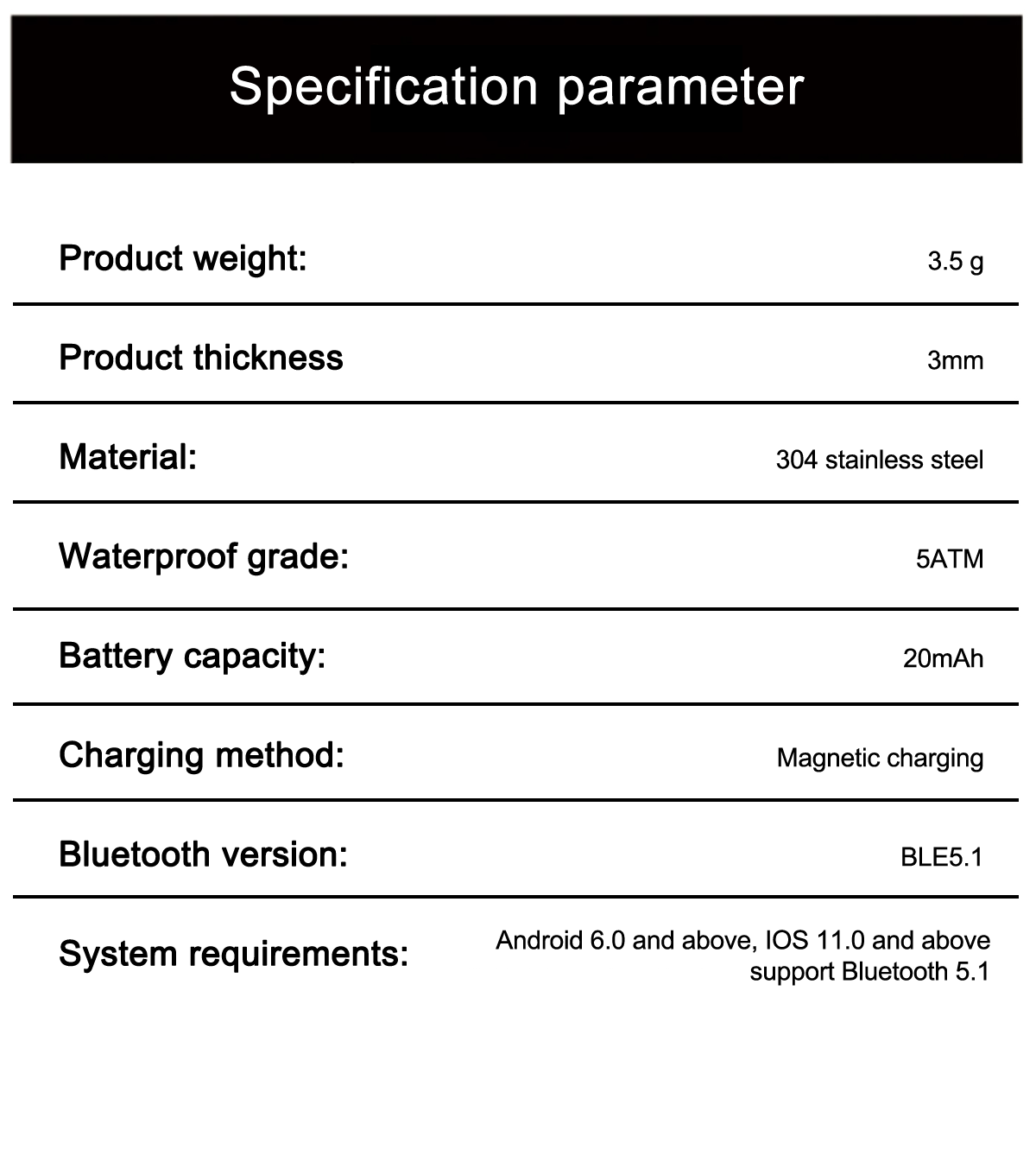System requirements: for Android 6.0 and above, Compatible with IOS 11.0 and above, support Bluetooth-Compatible 5.1