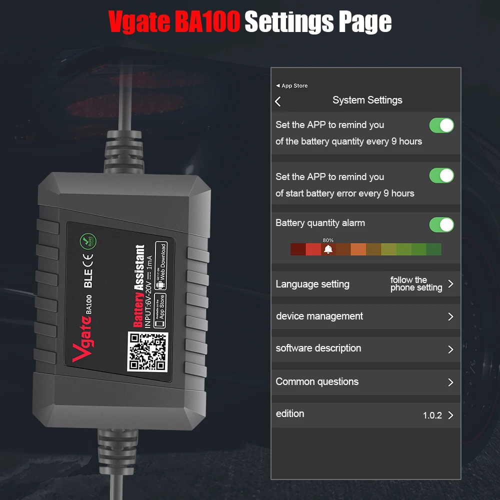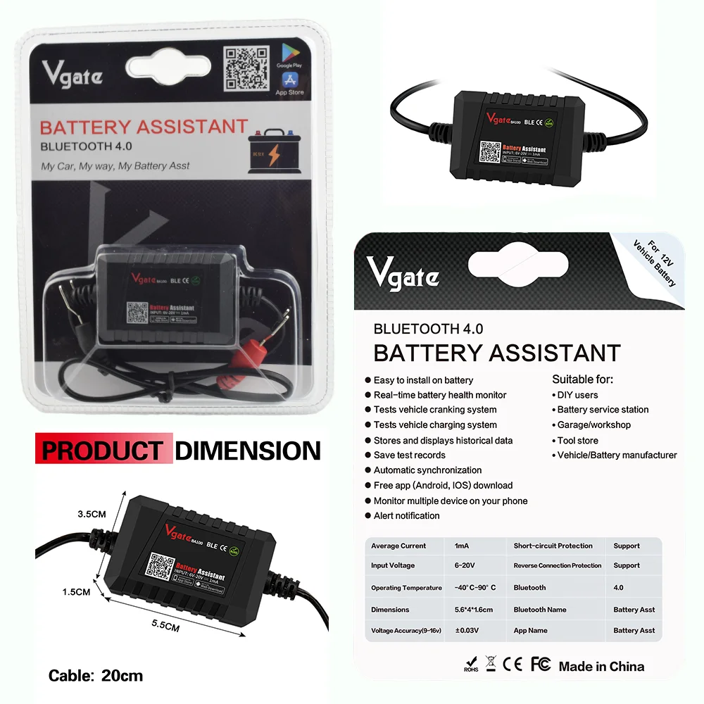 Vgate battery assistant is used to monitor the car battery, starting system and charging system. After being installed on the battery, the mobile phone can monitor the starting status and charging status of the battery in real time via the Bluetooth 4.0 connection.