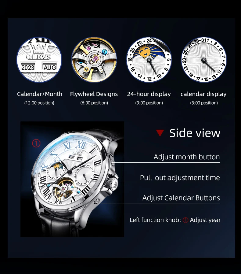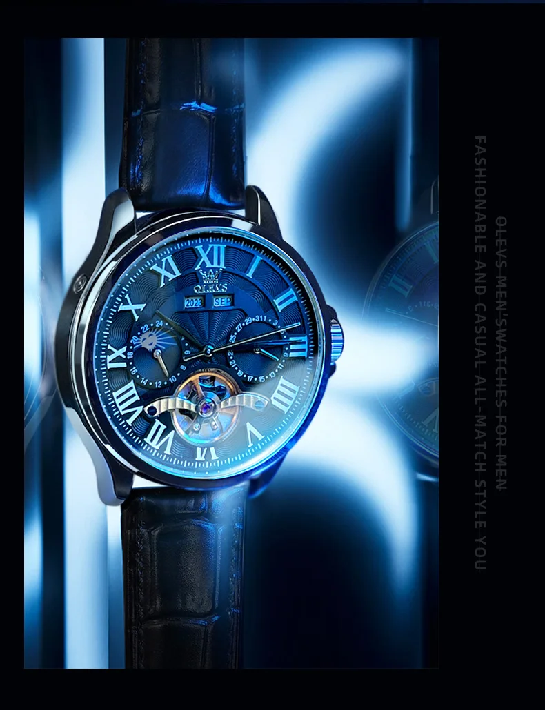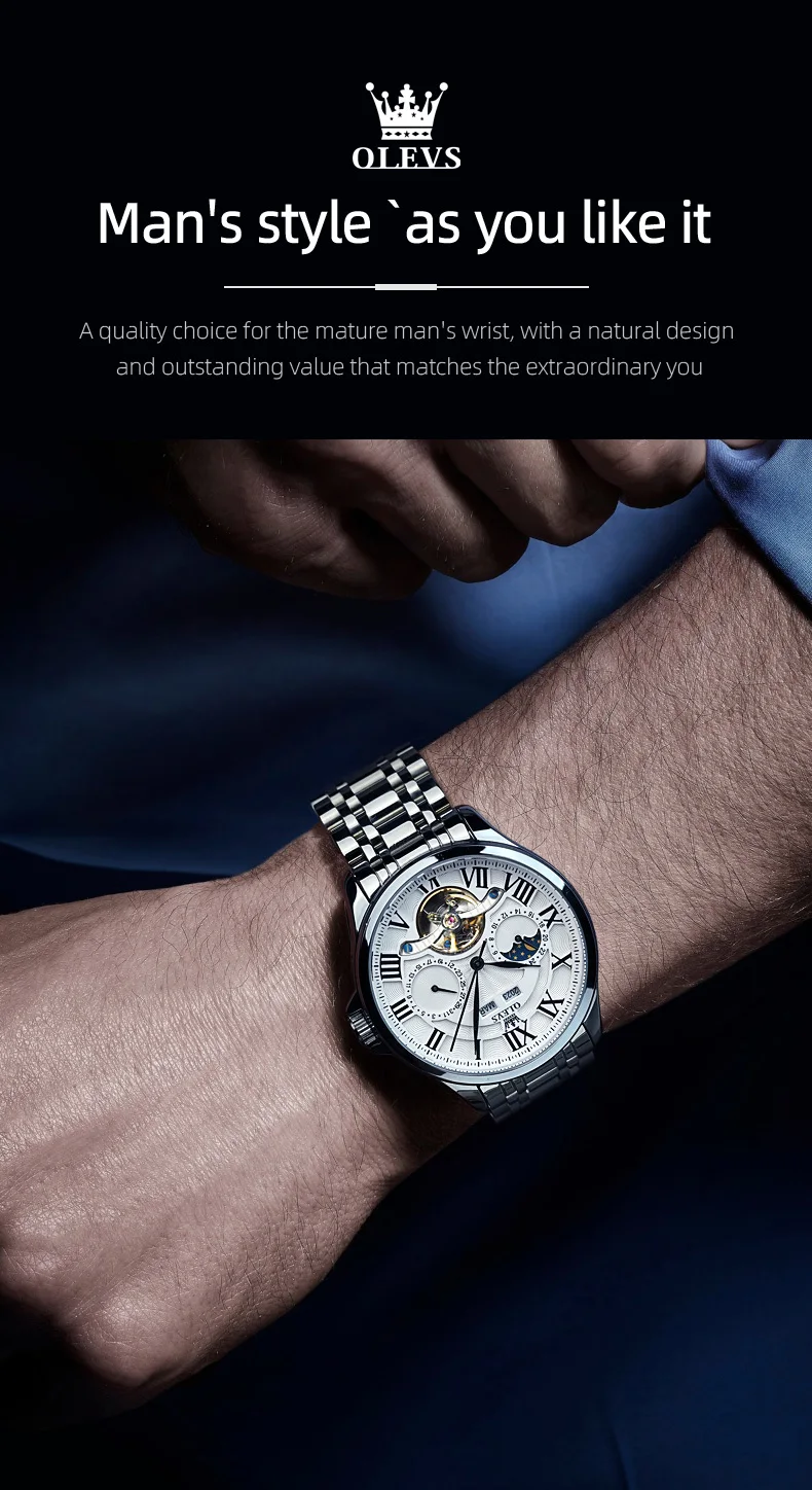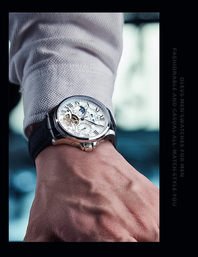 OLEVS 7013 Roman Scale Business Mechanical Watch For Men Hollow Skeleton Waterproof Man Watches Moon Phase Automatic Wristwatch