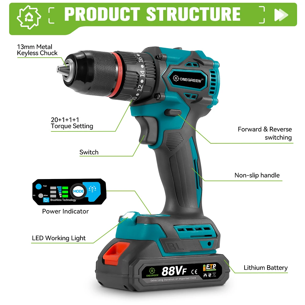 – 20 + 3 stage settings, delivers 20torque settings and 3 drill modes for high precision working.