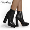 Onlymaker Women Pointed Toe Ankle Boots Black Matte Flock Chunky Heel Platform Booties Party Shoes Large Size Short Boots
