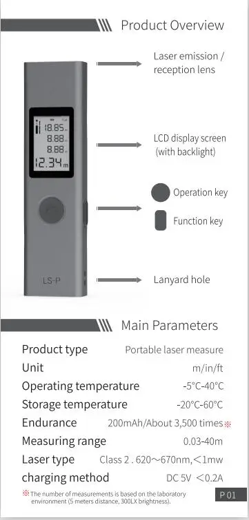 – 200mAh large capacity battery /About 3,500 times – Switchable among meter (m), inch (in), feet (ft), convenient to read the measuring results.