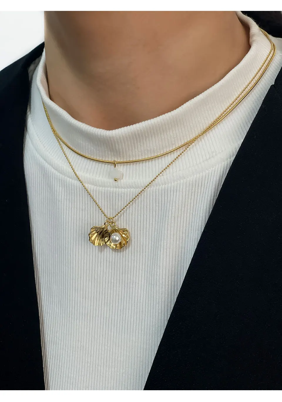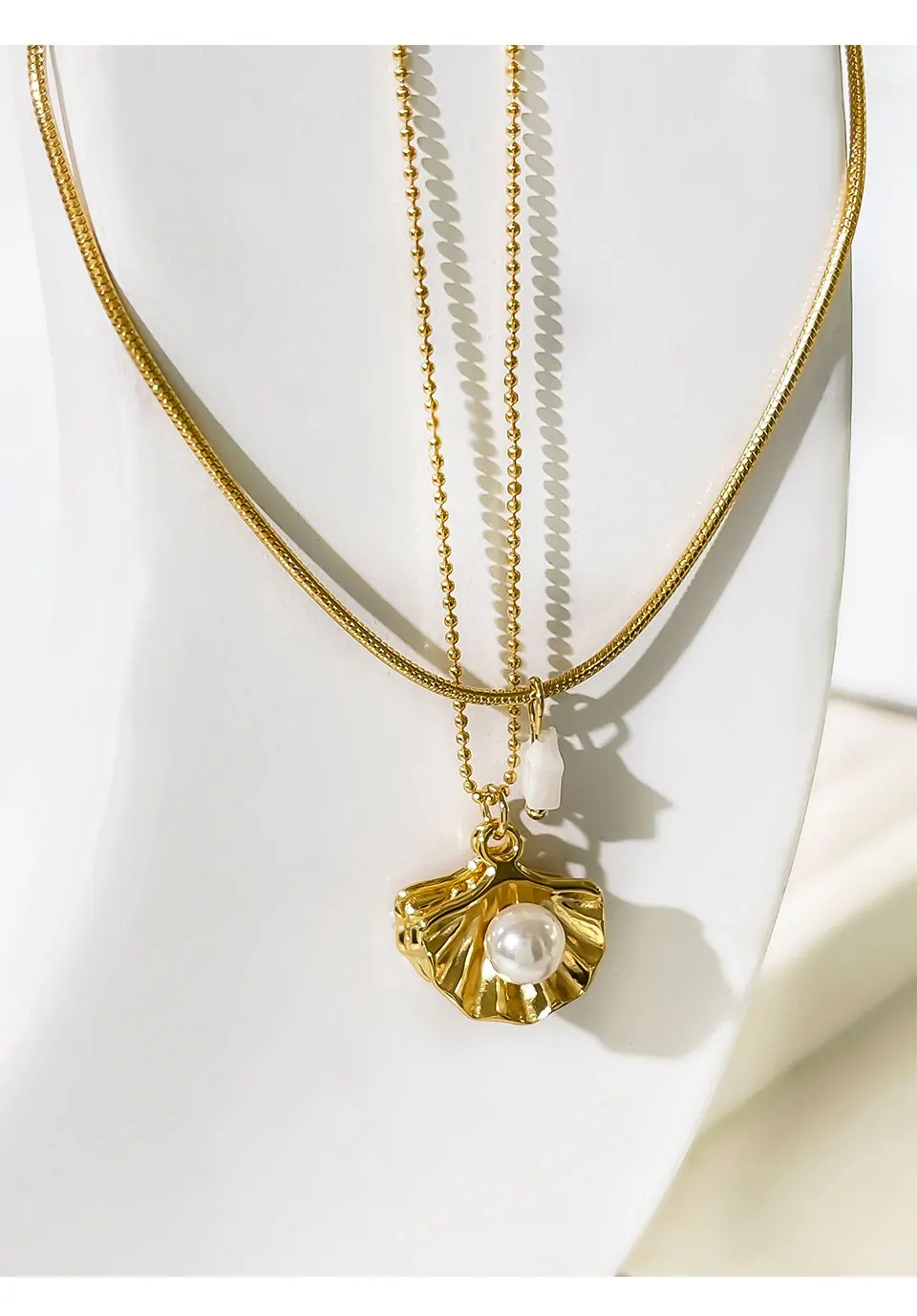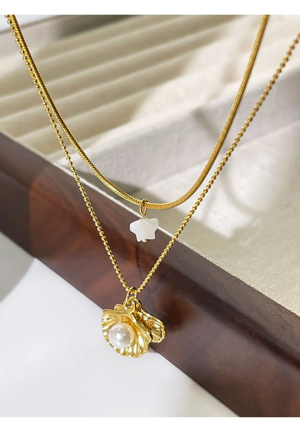 Peri’sbox New 18K Gold Plated Imitation Pearl Shell Pendant Women’s Necklace Sweet Sexy Double Layer Clavicle Chain Jewelry Gift