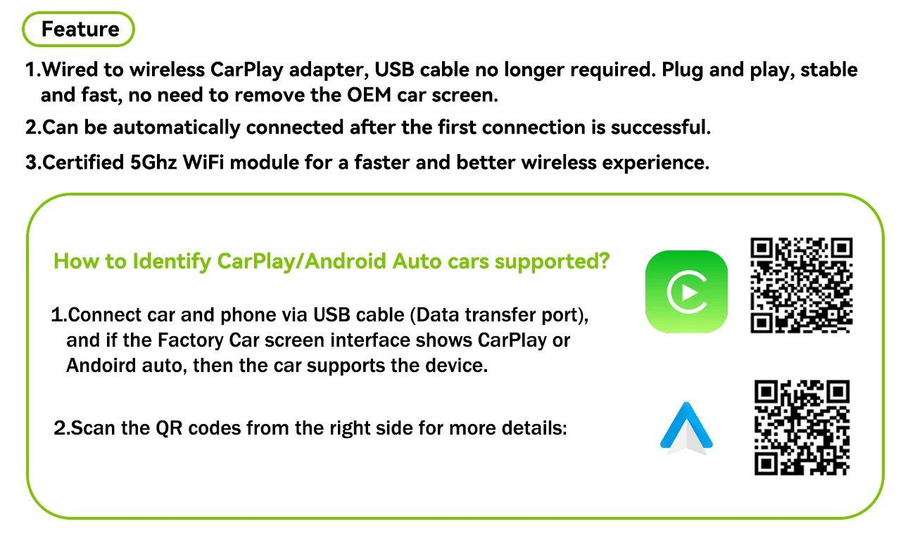☆Plug & Play: Phoebus Link wireless Carplay and Android Auto car adapter is a great accessory to enhance your driving experience. Plug & Play, a convenient and effortless solution to connect your iOS or Android phones to your wired Carplay or Android Auto cars