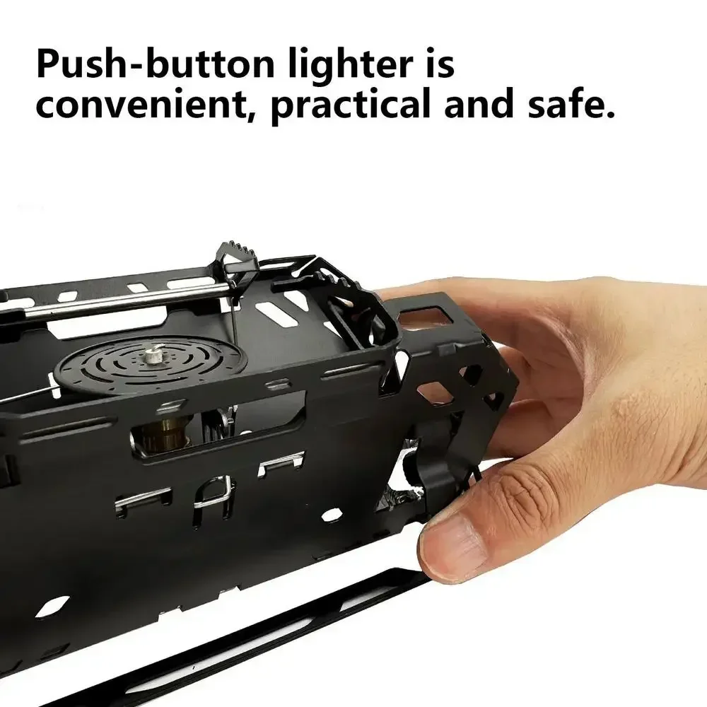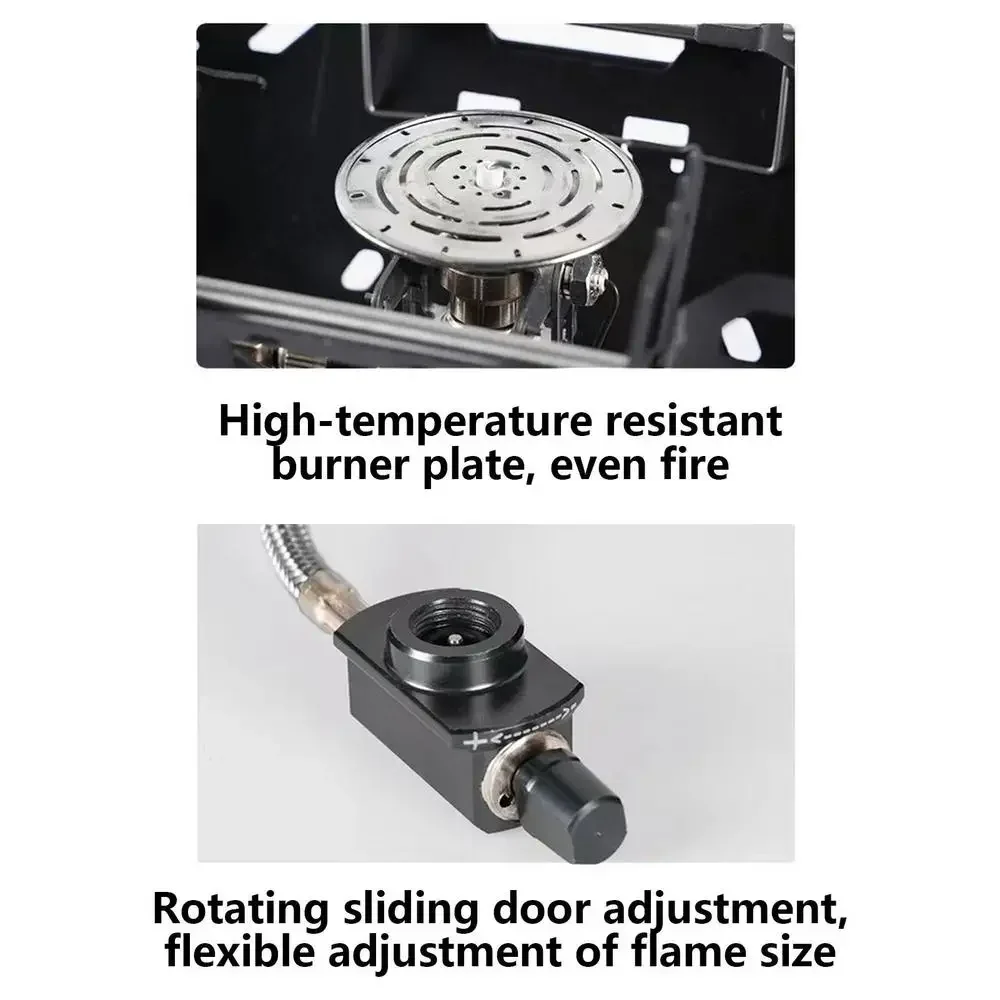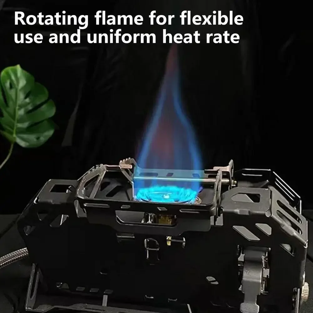 The perfect outdoor gear, our camping stove burner features a new windproof design that can withstand high temperatures. Its compact size makes it easy to carry on any camping trip. Rotate the switch to ignite the fire and enjoy a warm meal in nature.