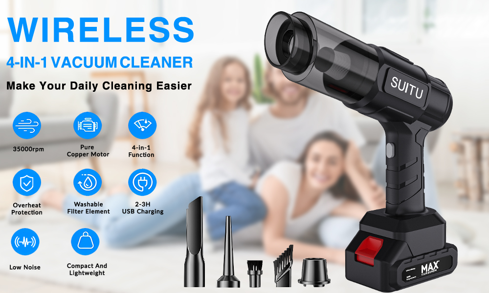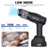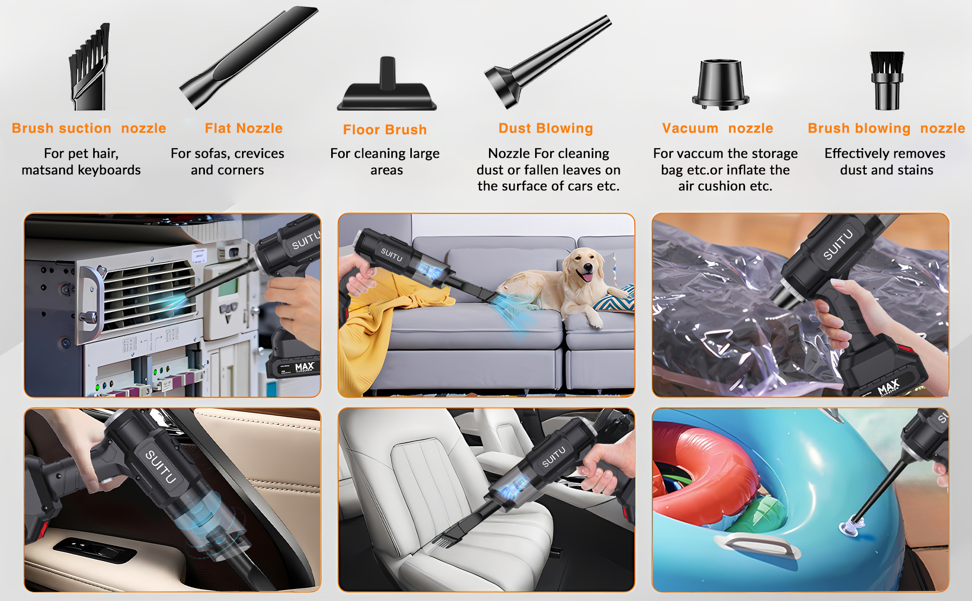 3. Mode: This wireless vacuum cleaner is three-in-one of blowing, sucking, and pumping, and has four use modes (Vacuum cleaning/Blowing dust/Aspirate/Blow air),powerful functions