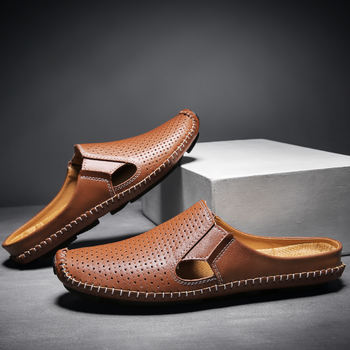 Men Summer Fashion Cow Split Casual Mules Male Breathable Half Loafer Slippers Mocassins Comfy Soft Flat Slip-on Leather Sandals