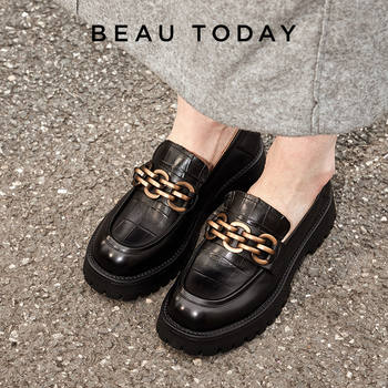BeauToday Loafers for Women Genuine Cow Leather Round Toe Metal Chain Slip-on Ladies Platform Shoes Handmade I27748