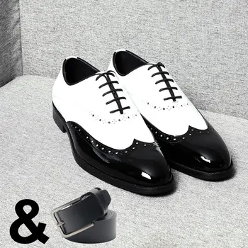 Elegant Man Dress Shoes White Black Genuine Leather Oxfords Wedding Party Social Shoes Male Wingtip Brogue Oxford Shoes for Men