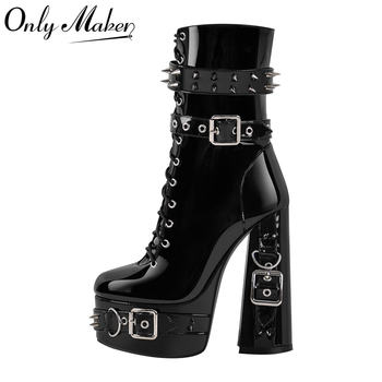 Onlymaker Women Platform Metal Buckles Lace-up Chunky Heel Ankle Boots Big Size Punk Booties