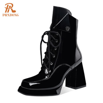 Women’s 2022 New Autumn Winter Shoes Genuine Patent Leather Chunky High Heel Platform Black White Dress Party Female Ankle Boots