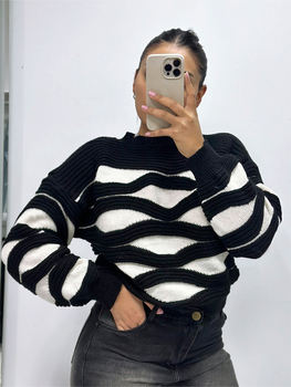 Women’s Oversized Round Neck Wave Stripe Dopamine Color Block Long Sleeve Crewneck Knit Sweater Pullover Jumper Top